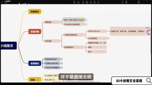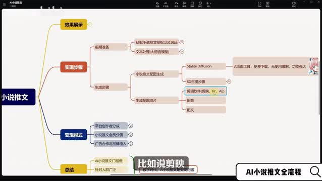 我们这些步骤里面所需要用到的工具就有大语言模型。比如说chat g p t或者是文心言豆包这种的。以及配图生成的ai绘画工具stable d fusion和配图成片的一些剪辑软件,比如说剪映p二a一这一些工具的具体的使用方法,在接下来的视频里面都会有一个详细的讲解。从制作一直到变现,用到的所有的工具已经给大家准备好了,需要的小伙伴可以在评论区给我留言,我会一一回复发送给你。