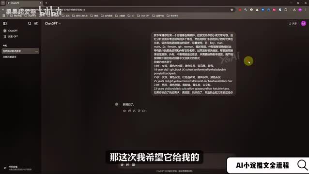 我们可以自己稍微对这一些分镜进行一下拆分和概括,然后再再来进行一个系列配图的输出。分析完成之后,我们还可以通过这一个大语言模型建立一个男主角或者是女主角的形象。同样呢我们把要求发送给他,那这次我希望他给我的就是提取这一段文本中的男主角或者是女主角的一个人物形象。如果我们发给他的这一段文本里面没有很明显的一个形象的概括,那我希望他会根据这段文本里面的这一个特点来给我概括一下这个主角的形象。
