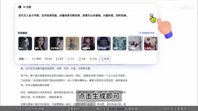 依旧是在夸克里一站式无缝衔接。点开a a生图,输入刚刚生成好的提示词,选择水墨画风格模板比例选择九比十六,点击生成即可。生成完成以后选择我们中意的一张保存下来。其他分镜图也是相同的操作,免费无限次生图,不满意可以多次调整,真正的零门槛。