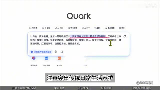 我们先来看一下对标视频,一要经常推,头发要经常梳,二要经常提。ok此类视频的主题属于国学养生知识,内容是日常生活养护和和传统国学知识相结合,画面则是水墨风的古人生活场景。而这些全部可以借助夸克一站式生产。夸克最近全新升级来搜索功能,上线深度思考模式。