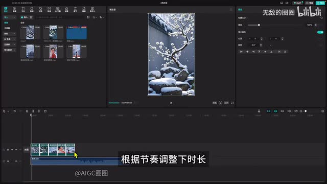 时长限制在三十秒内,多余的我们会剪基调,而朗诵的音频在后期处理时,我们用剪映生成。打开剪映,导入刚刚生成的素材,将视频和音频拖入主轨道,根据节奏调整下时长,使得每句是对应一个画面。接着点击文本,复制一本。点击朗读,选择一个儿童声试听一下,这个还不错。