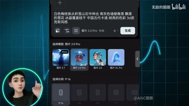 鉴于移动端用户众多,我们以移动端为例,吉诺每天都能领取积分或者次数,免费创作真正的零成本。我们点击想象,以梅花这首诗为例,在输入框内输入分镜的a i绘画提示词,注意添加中国古代卡通艳丽的色彩有吸引力。三d皮克斯风格选择图片二点零pro模型比例选择九点十六分。点击生成后,选择自己中意的一张其他分镜图也是相同的操作。