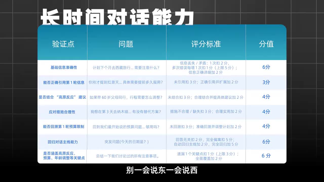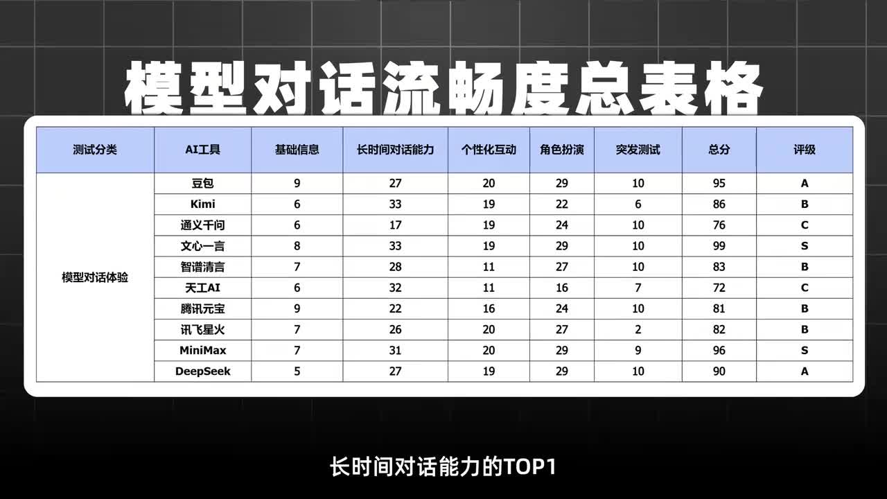 天空a i kimi紧随其后,虽然在行程上面没有明细项,但给出的注意事项也足够完善,这四个大模型都可以拿到s不过啊也有的模型在对话中出现了不合理的情况,比如在推荐景点的时候,当我要求低海拔的时候,他们连续两轮都推荐了海拔差不多的地方,甚至还推荐了海拔更高的地方,这实在是有点说不过去了吧。文,熙妍x一在对话中不仅信息关联度更强,而且预算计算的非常准确,推荐的旅行路线也非常合理,再加上附带温馨提示和更加人性化的备选方案,看起来这个模型在长时间对话方面可是有着独特优势的。以上长对话中,kimi文馨妍x一mini max和天空a i都以优秀的逻辑能力赢得了s级。天空a i获得了三十二分,现在已经排到了第三名。