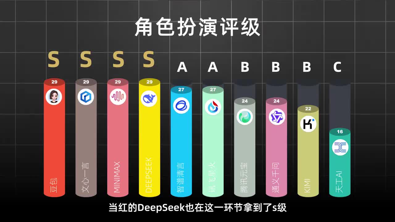 像豆包mini max和星火在个性化互动评分上都可以拿到s级,他们生成的昵称和签名既有创意又契合用户特征。文心也仅落后一分,获得十九分。而质朴青年和天空a i强堆关键词,并且回答的内容也过于单一了,只能拿到c了解了模型的基本信息和对话能力后,咱们让模型各自玩起了角色扮演。客服、心理咨询师、健身教练,各家模型每个角色都能拿捏得恰到好处,切换自如,像deep sik在角色扮演中的评分可是达到了s级。