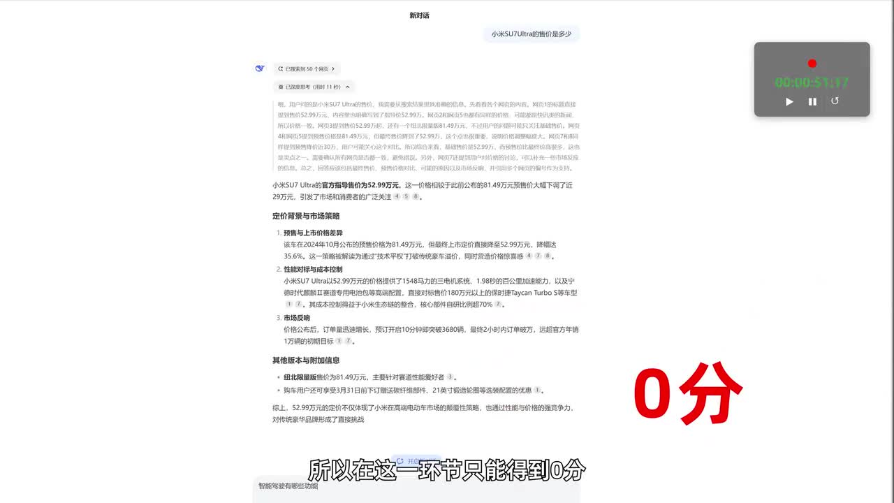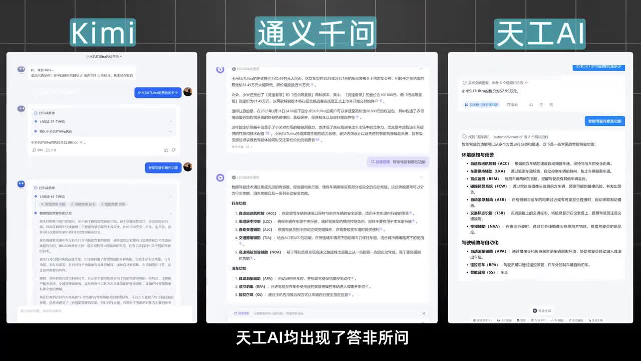 在第一轮基础测试中,我们测试了前后语境响应速度以及多元支持。比如连续提问小米速七四的售价是多少?智能驾驶有哪些功能,最高续航有多远等等。当问到第二个问题时,像kimi碰一千问天空a i均出现了答非所问。原本只是想了解当前车辆的相关信息,他们则开启了智能驾驶的功能介绍模式,稳定的前后语境理解这个指标可是关乎到ai助手能不能像我们人类一样理解问题的来龙去脉,给出准确有稳定的答案。