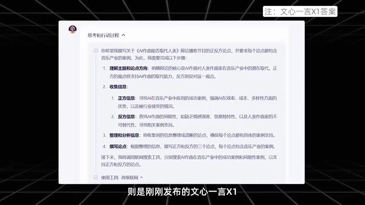 在设计晚会的黑神话节目中,也是唯一一个提到了像大圣残躯、黄风岭这些游戏内容的a i工具。其他不少ai工具还在说什么师徒取经的事,不过deep sik也不完美,他也不识数,二百字的分析硬是写了四百多字,而另一个强者则是刚刚发布的文心言x一,它的表现与d sik非常接近,同时它还是数。可以看到他的思考过程中有多次提到要限制字数。文心一言x一的联网思考是先思考再联网再思考,这个过程其实也更像人类啊,不会因为搜索到信息污染思考的内容。