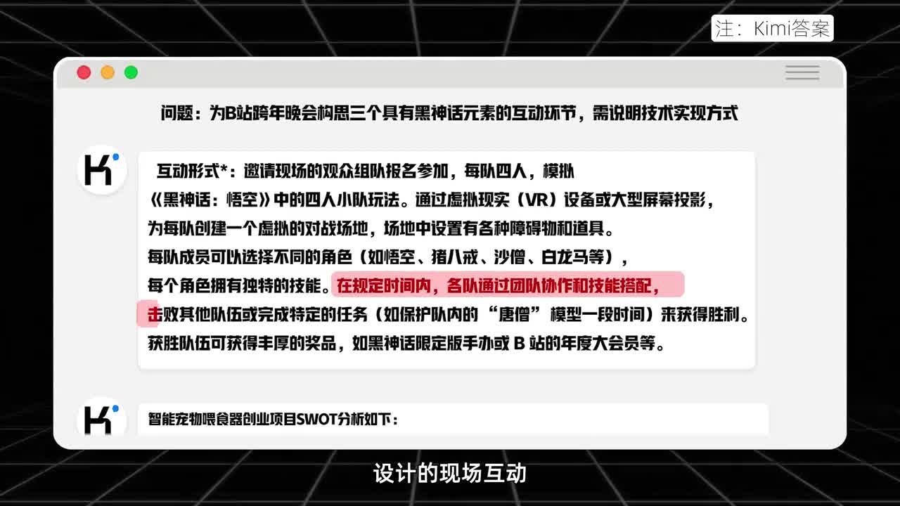 其中最让我感到意外的是kimi在很长一段时间里,我一直都是chat g p t搭配kimi一起使用的,还算满意。但在这次测试中,我让kimi写小于八个字的广告语,他写了十个字,我让他为b站跨年晚会加入黑神话的内容设计的现场互动,如同公司年会让他用二百字分析项目,硬生生的生成了六百多字。当然了,这并不是km一家的问题。这种字数与指令不同,理解偏差让人感到莫名其妙的内容,也在其他ai工具中都有出现。