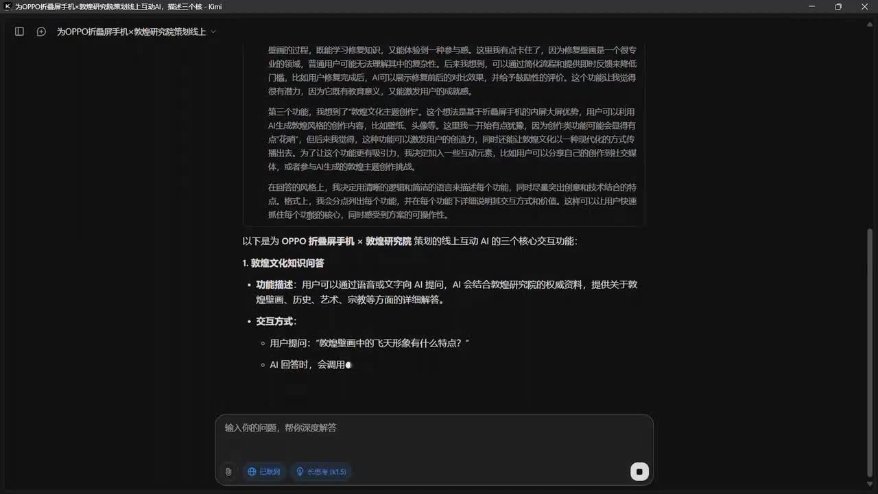 但在这其中也有一些a i工具脱颖而出,一些a i工具表现平平。比如在解读生成式人工智能服务管理暂行办法的第二章时,包括豆包通义、千问质朴、星言、天工、元宝、讯飞mini max等在内的七款a i工具,都是根据这个暂行办法的名称自己编了一个第二章,与事实不符。在给oppo折叠屏手机协议敦煌研究院的跨界营销方案时,包括kimi通义、千问讯飞、星火mini max在内的四款ai工具完全没有提到折叠屏相关的创意,替换成任何类型的手机均可以实行。但同样的问题呢,质朴就提到了可以通过屏幕折叠调整角度的方式实现壁画修复。
