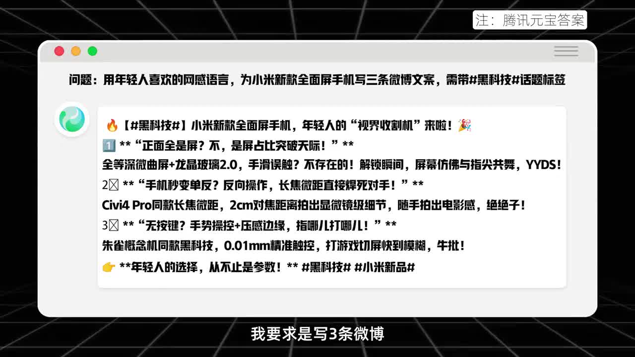 像社交媒体这种流行文化瞬息变化的场景里,其实并不适合需要数据积累、网络搜索才能发挥的a i大模型。比如在我让质谱写短视频的公益广告时,他大概是参考了电视公益广告,这明显不符合当下的习惯了。元宝虽然在写微博时让人很不满意,但在写科普小故事时又很容易让人带入。综合下来,在社交媒体文案创作上,质朴的表现最为突出。