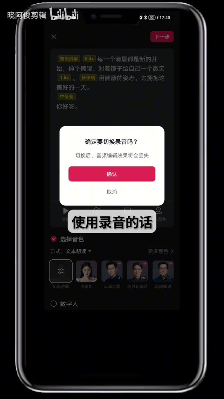 如果对音色库里的声音都不满意,可以选择自己录音。需要注意的是,使用录音的话,之前设置的调语速、停顿都会失效,因为这些都会取决于你自己的朗读节奏。