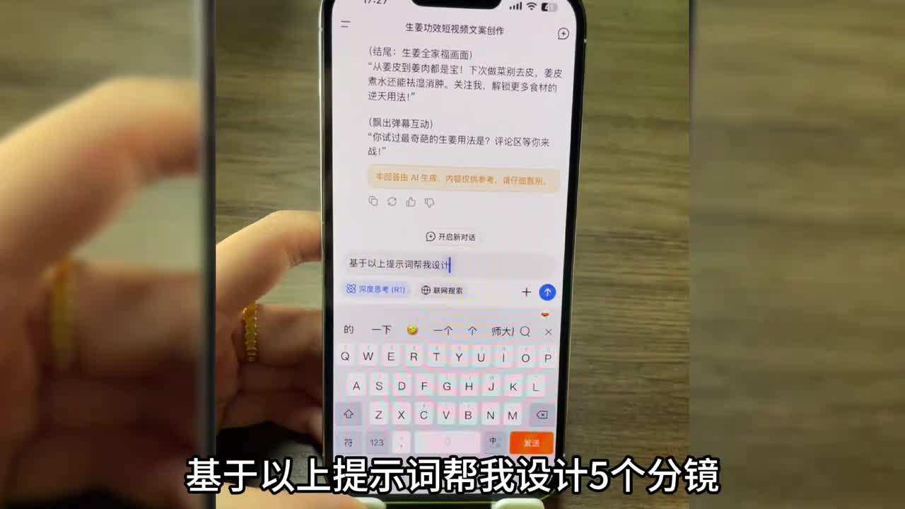 比如说我今天这样说。生姜有什么样的功效?帮我以此为选题,生成一篇三百字的短视频文案。好,点击发送我今天做的养生类目。有关于生姜,我们先让他帮我写一个短视频的文案,经过他的时间思考之后呢,特意帮我写出我需要的一个短视频的文案。