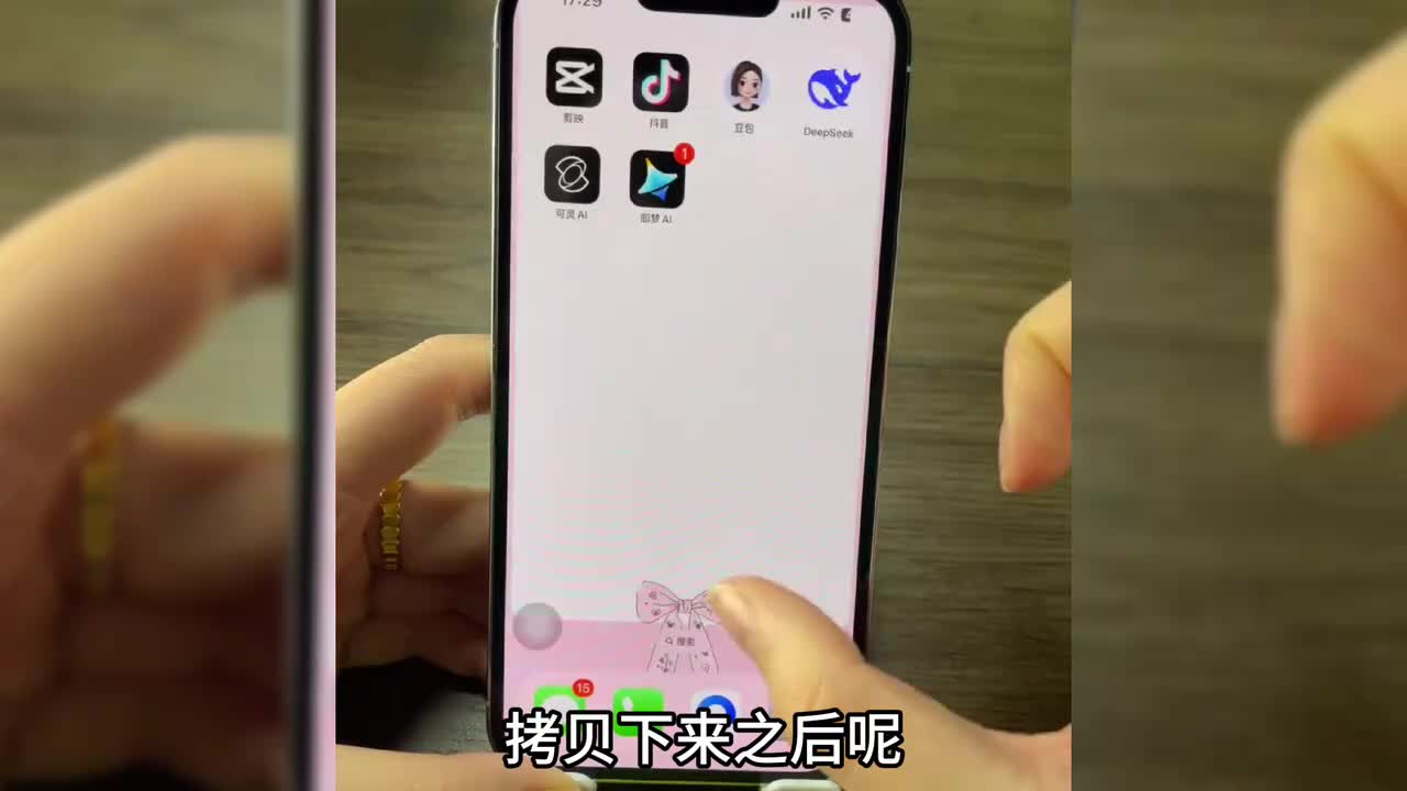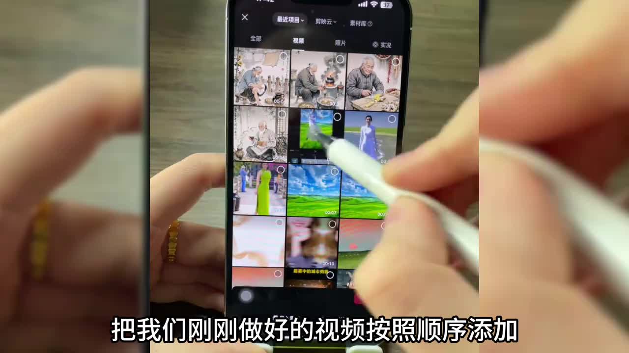 然后接下来你需要把这些视频呢依次保存下来。接下来我们需要打开我们的剪辑工具,点击中间加号开始创作。点进来之后呢,把我们刚刚做好的视频按照顺序添加一二三四,好,全部添加进来。加进来视频之后呢,我们需要把deep sig那哎第一次让他写的那个短视频文案给它粘贴进来,我已经准备好了。