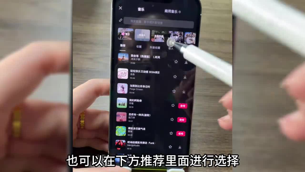 这样调整完毕之后,接下来你可以再给这段视频增加上一段背景音乐。返回再返回,找到我们的音频,点击音频,点击音乐,可以在这个位置搜索一段音乐,也可以在下方推荐里面进行选择。我建议大家呢点这种纯音乐,因为这样的话不会影响我们说话的声音。比如说我们今天喜欢听这首声音,直接点击使用,点进来之后往后检查一下,看一下音频是否对齐。