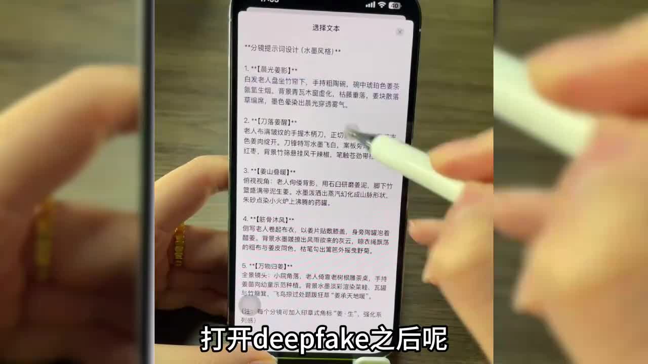 那这个文案呢一会儿就是我们所需要的,先别着急,让他再帮我设置一个跟进的一个镜头来怎么做啊?继续在这个位置点击生成。基于以上提示词,帮我设计五个分镜提示词,水墨风格有老人和食材,背景是农家小院的角落。通过他的思考之后呢,他也帮我把这个分镜的提示词已经帮我准备好了。那接下来我们复制好文字去制作成图片,制作成视频。