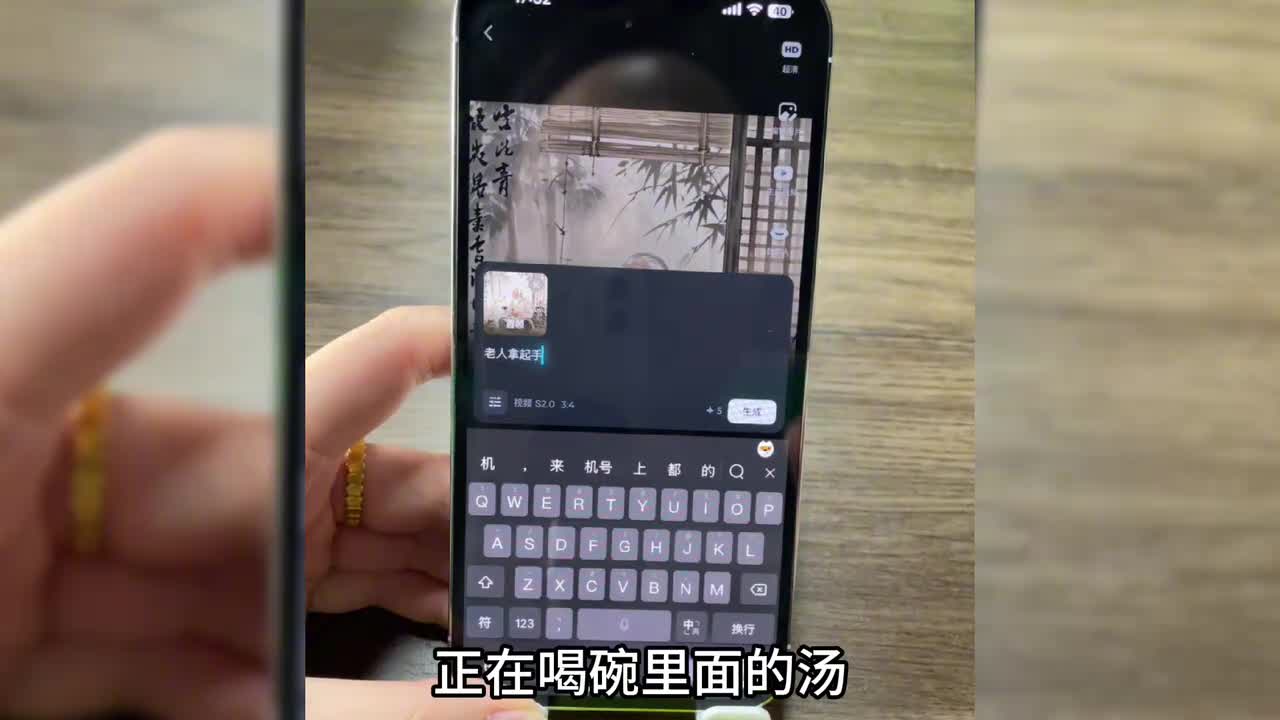 点击生成视频,我们在这个位置描述个动词就可以了。老人拿起手中的碗,正在喝碗里面的汤。我们的描述之后呢,我们这个短视频已经做好了。先来看一下第一个画面里面的视频。
