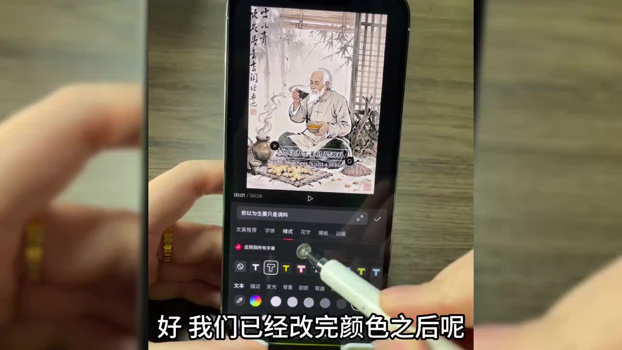 比如说我们先点这个黄色,可能会更加显眼一点,对不对?白色、黑色都是可以的。好,我们先改完颜色之后呢,我们点击对勾就可以了。点完对勾之后,把你的字体呢调整在合适的位置。好。