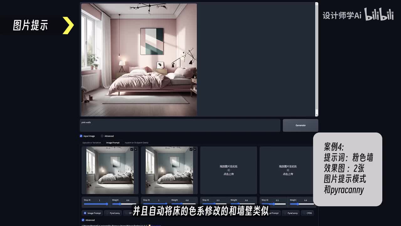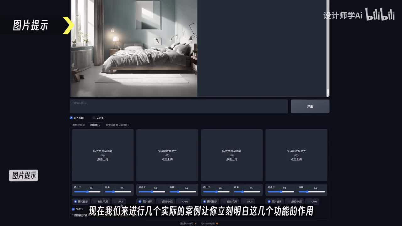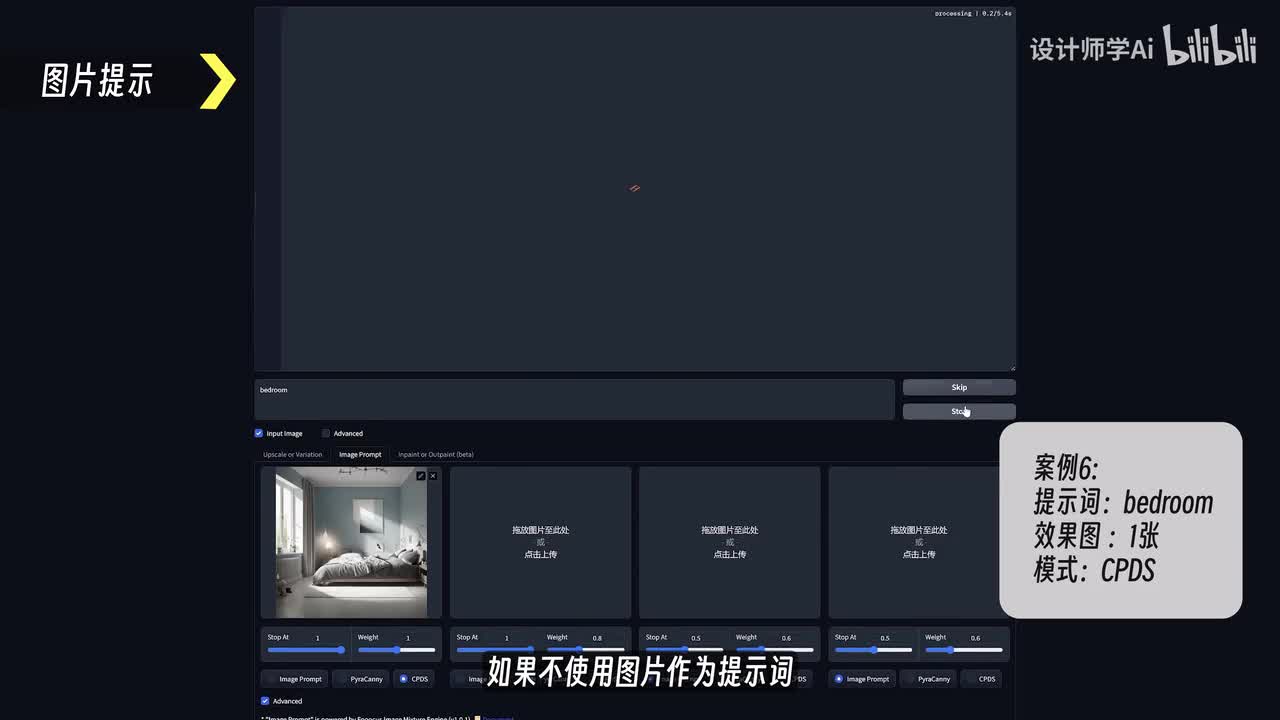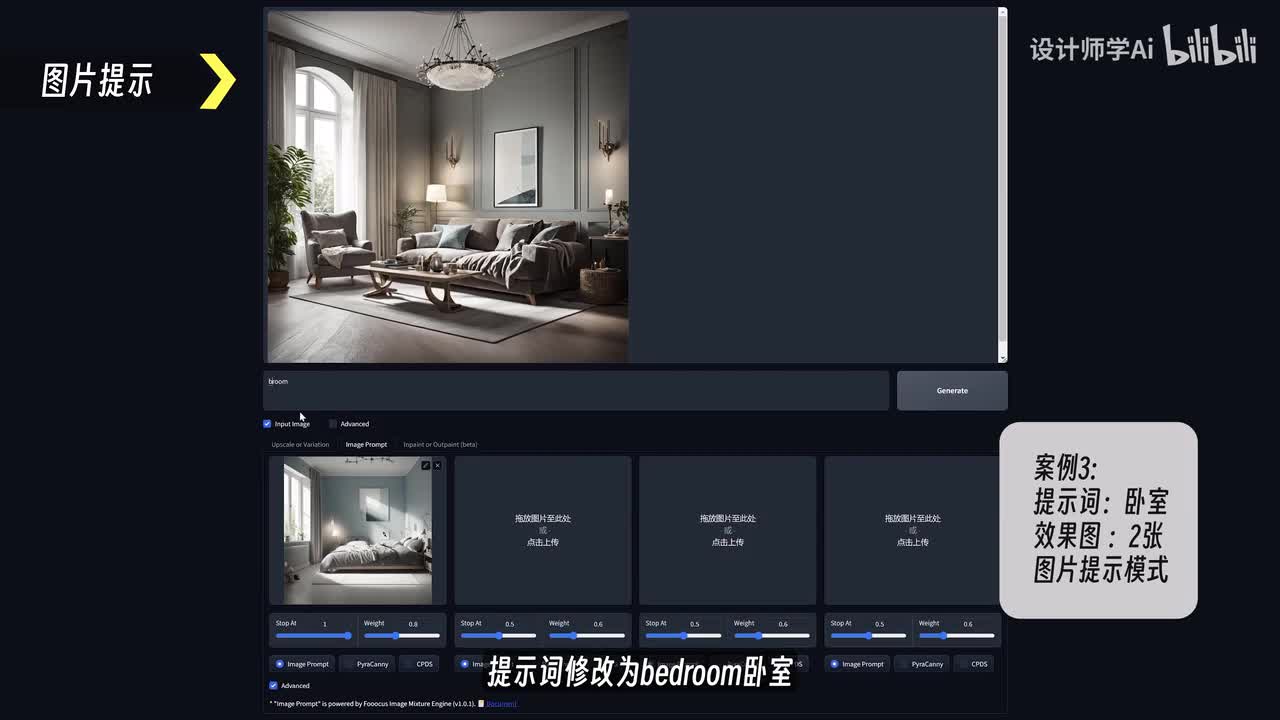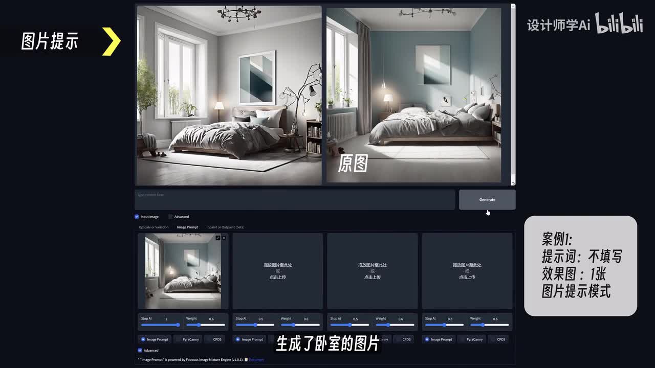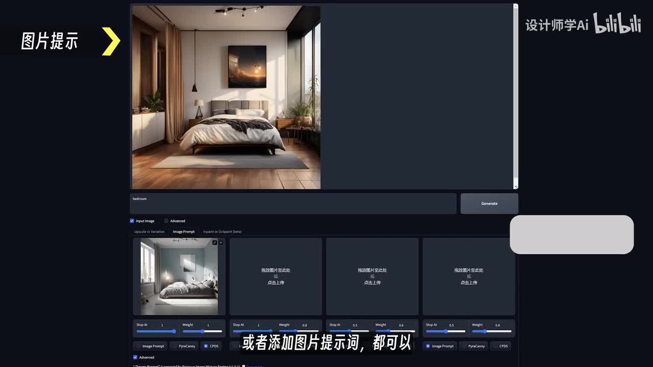 案例六还是使用卧室这张效果图功能调整到c p d s,stop at和weight的值都调整到一输入提示词bedroom。在只使用c p d s的时候,如果不使用图片作为提示词,就一定得写一些文本提示词。因为从c p d s输入的信息中是不包含任何这张图片的信息的。所以得让a i知道你生成的图片主题是什么,点击生成。