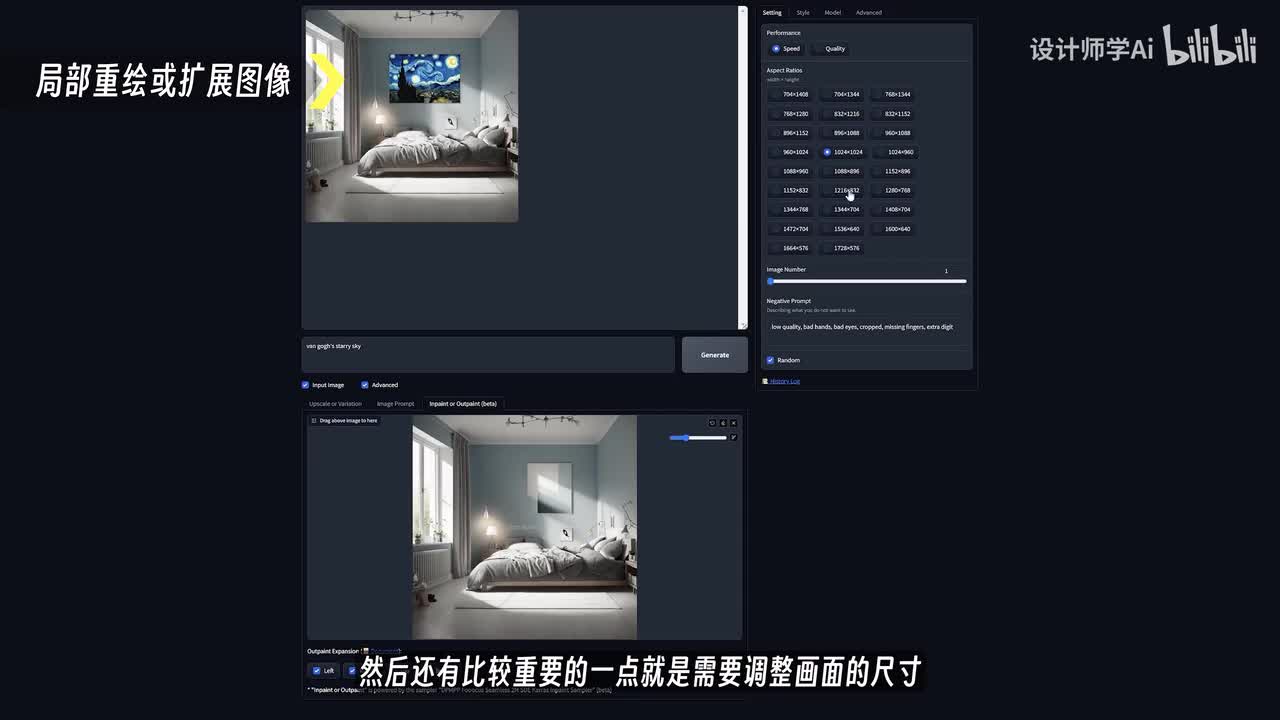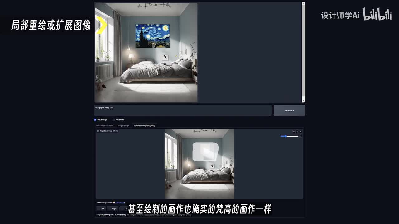绘制豪蒙版区域之后,输入对应的提示词,点击生成。还是符合透视正确,光影正确,甚至绘制的画作也确实的梵高的画作一样。这就是局部重绘的能力。然后展示一下扩展图像的功能,点击这里清除画面上的蒙版。