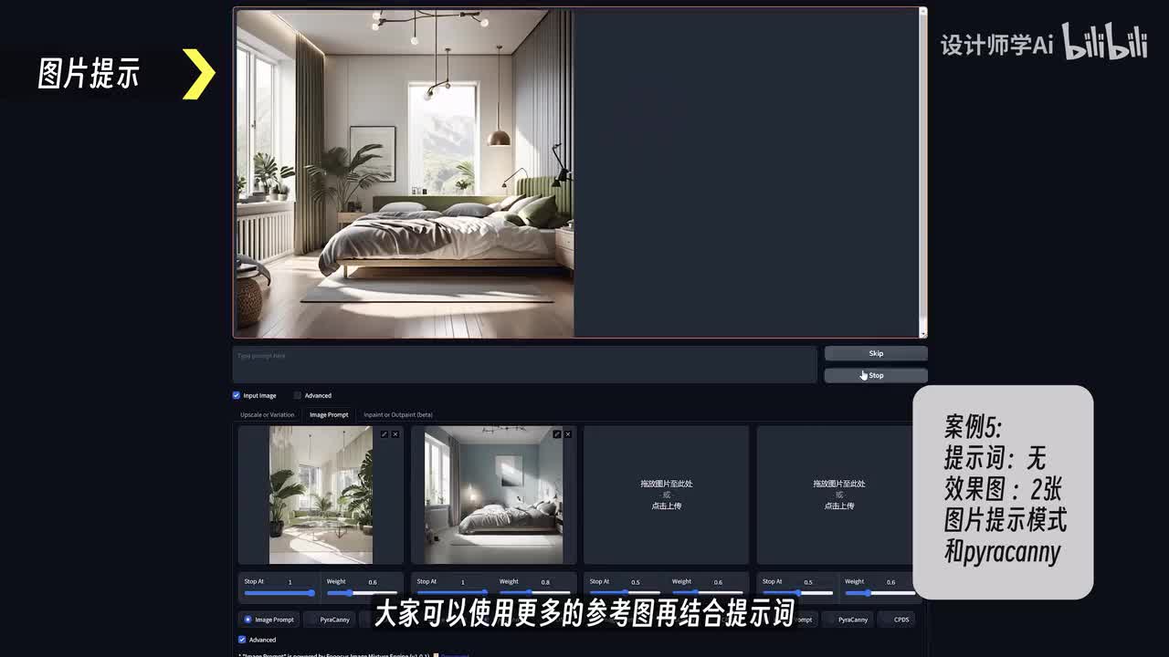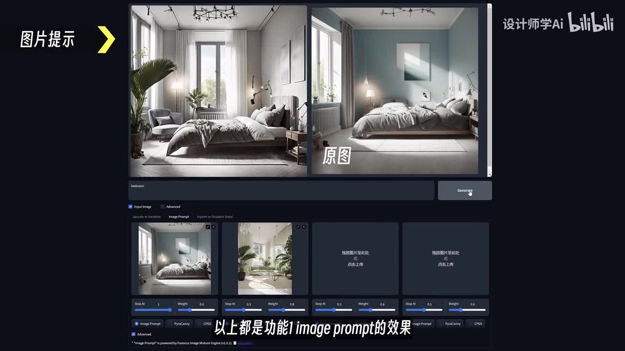 生成的图片在卧室的基础上添加了绿植。并且整体风格还是保持第一张的类似,如果想要风格更加偏向第二张,只需要将其位置值调高即可。以上都是功能一image prompt效果。接下来讲一下结合para canny的效果,阿里四将刚刚上传的第二张效果图删掉,将同样的效果图移放到第二栏,选择功能为para kenny,将其stopped值调整到一。
