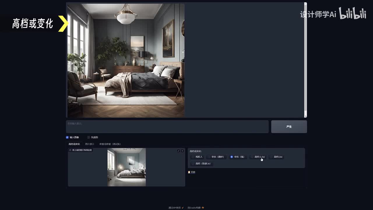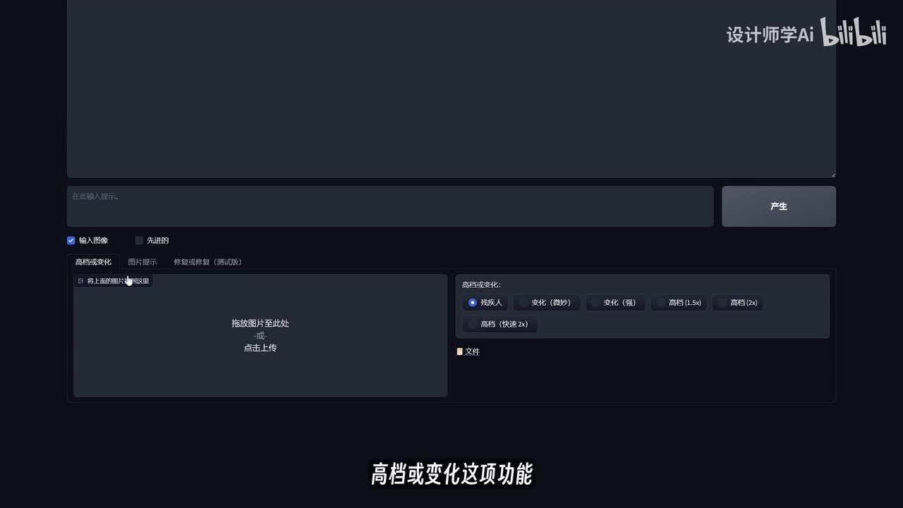 首先我们打开focus的界面,升级后的界面改变的地方是下方插件栏多了一项输入图像按钮,打开之后分别有三种不同的类别,分别是高档或变化图片提示、局部重绘或扩展图像beta。高档或变化这项功能,作者是根据major y的工具栏为灵感进行制作的。我上传一张效果图,在右侧可以选择是变化还是分辨率提升。比如我选择变化微妙提示词框中,我不填写任何的内容,点击生成。
