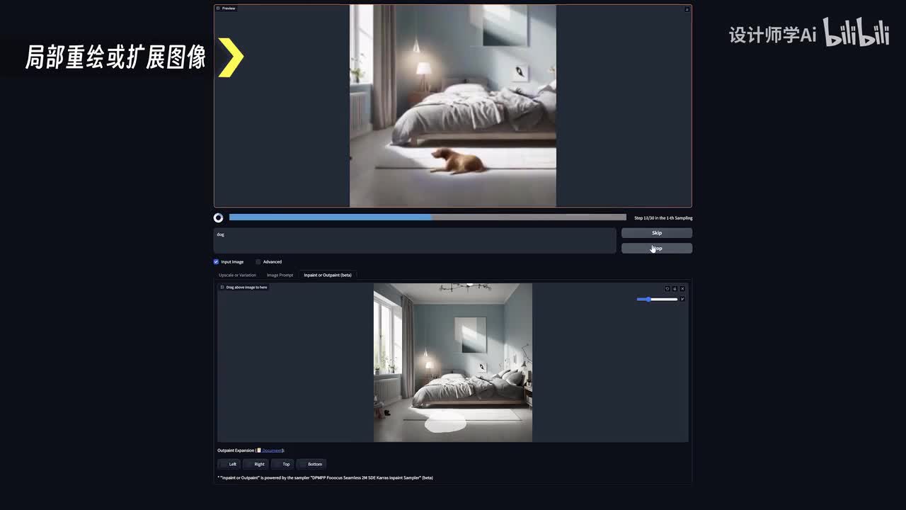 比如我想在图片的这个区域趴着一只狗,我将这片区域进行绘制,然后在提示词中填写dog。点击生成。图片就在对应的区域生成了一只符合透视和光影的狗。再换一个,我想把这幅画换一张,换成梵高的星空。