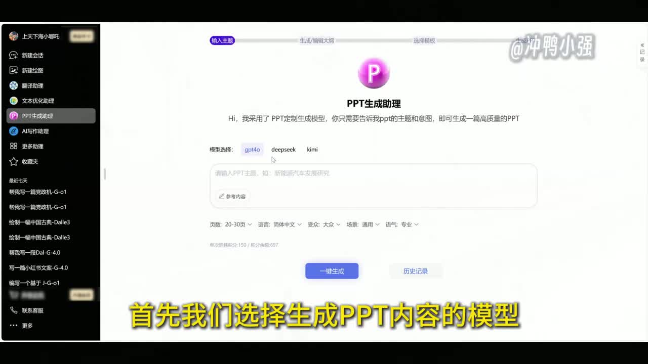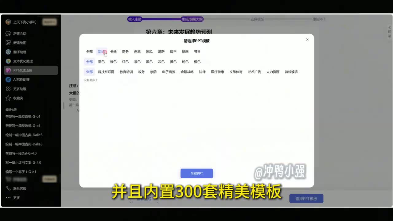 不同于市面上一般的p p t生成工具,它可以调用deep sick和chat g p t生成高质量内容,并且内置三百套精美模板,以实现更好的p p t效果。在这上面生成p p t很简单啊,只需要三步。