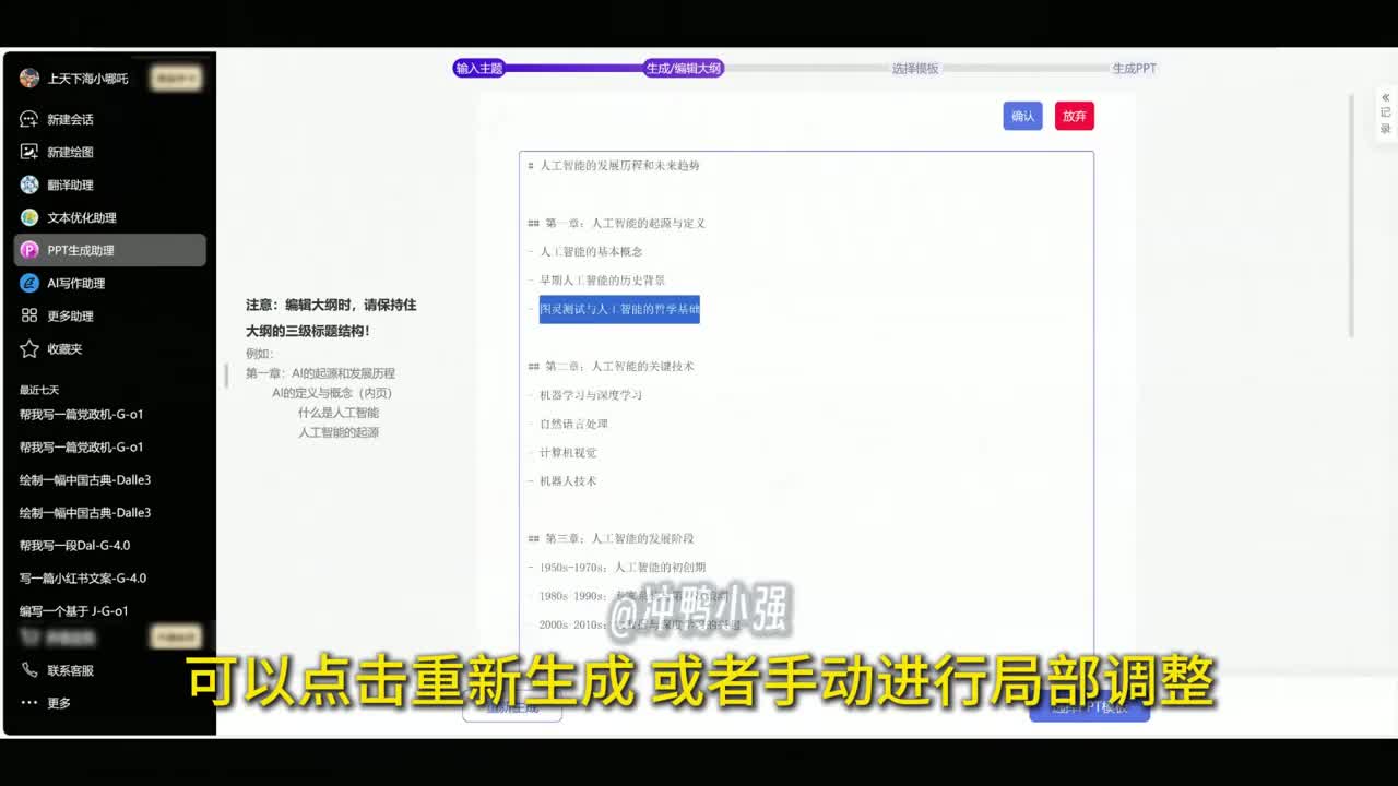 如果不满意刚才生成的p p t大纲,可以点击重新生成或者手动进行局部调整。调整好以后进入第三步,选择p p t模板。