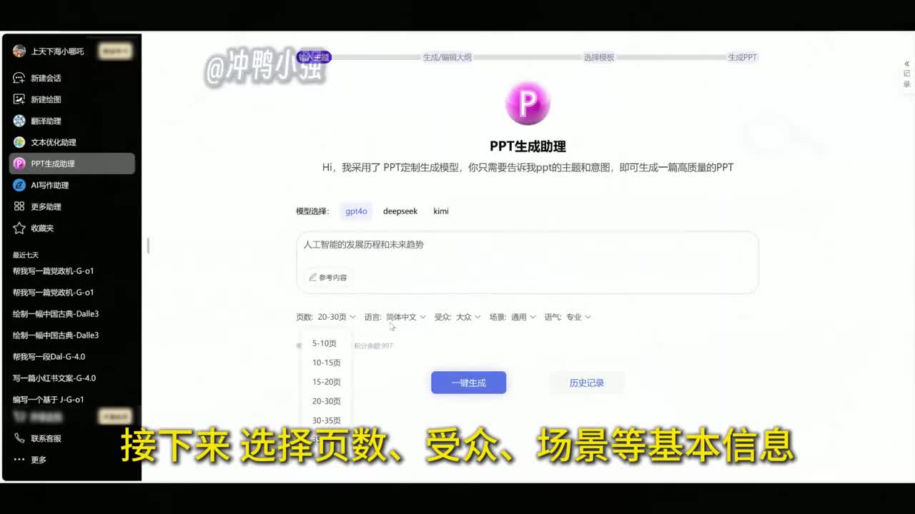 第一步输入主题和补充信息。首先我们选择生成p p t内容的模型,这里就选p p t吧。