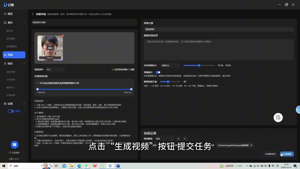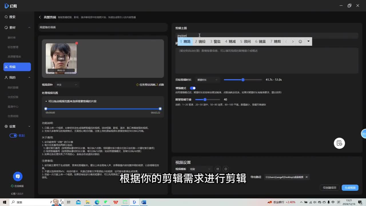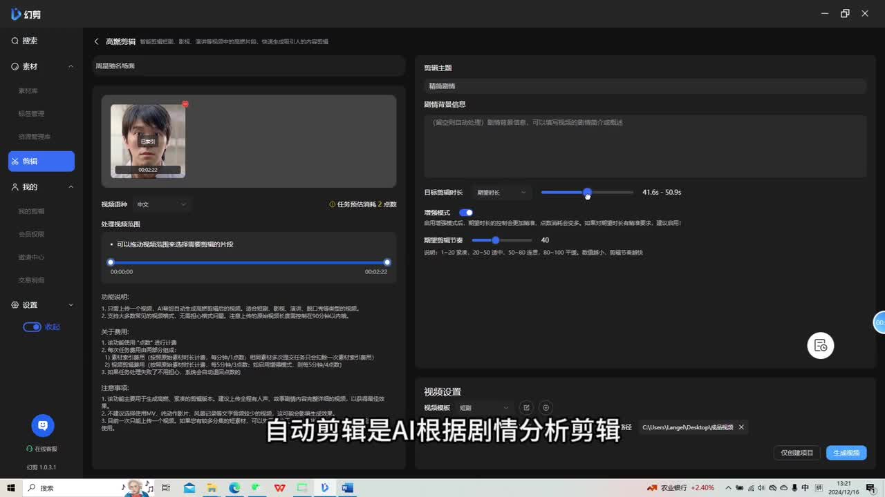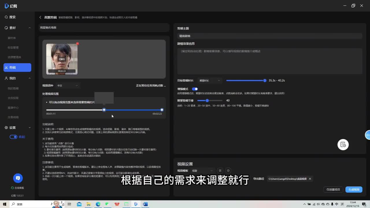 可以填写,填写之后有利于a i更好精准把控剧情逻辑,剪辑出片的逻辑性更强,我这里先不填。然后是目标剪辑时长,有自动剪辑和期望时长两个选项。自动剪辑是a i根据剧情分析,剪辑时长是固定的,每次生成的视频时长差异可能很大。如果希望更加精准的控制输出的视频时长,就切换到期望时长模式。然后拖动选择自己需要的时长范围,并勾选打开下面的增强模式。