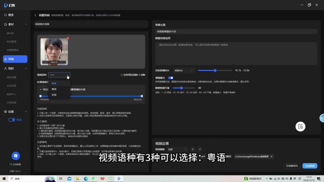 这里可以直接选择上传素材视频。我现在选择一个影视剧片段进行演示。视频鱼种有三种可以选择。越。中文以及英文,根据素材人生的语种进行选择即可。