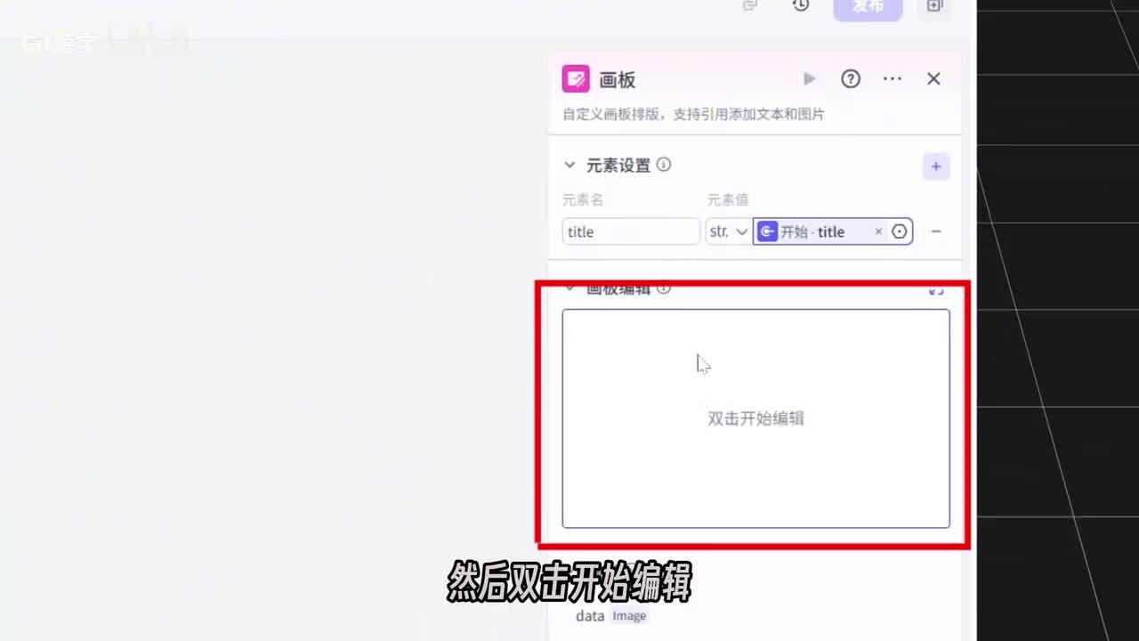 接下来在大模型后增加一个画板,修改名称为背景。元素设置中增加一个title。祭视频的标题。然后双击开始编辑,这里根据你的视频最终分辨率来选择尺寸,上传一张背景图片,把它拉大,把画板铺满为止。