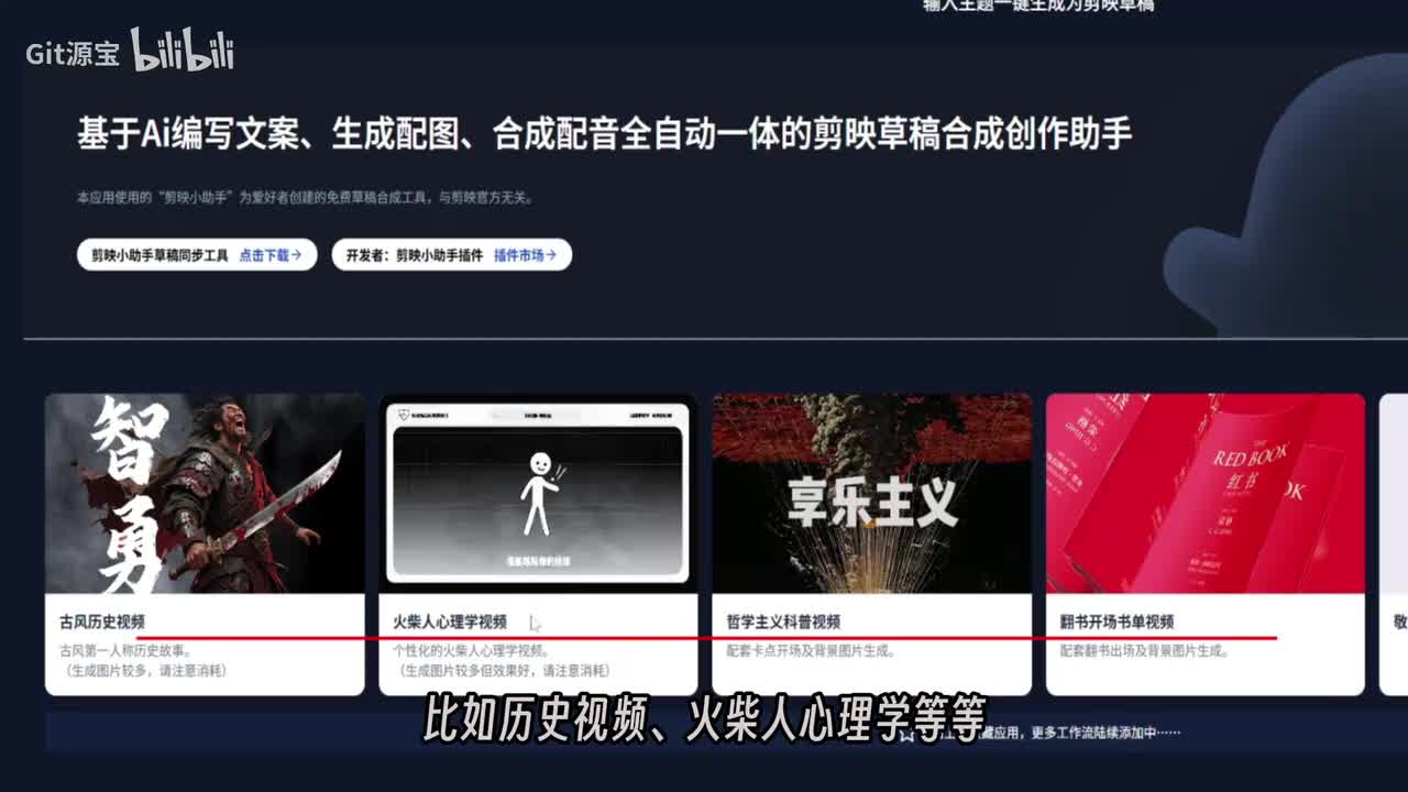 使用前需要查看剪映的草稿位置,并复制到小助手的设置中。如果你是第一次使用,可以白嫖一些现成的工作流,像这个就可以生成四种不同种类的视频,比如历史视频、火柴人心理学等等。不过这些现成的工作流是不能修改的,想要结果更加可控,还是推荐自己搭建。下面我就来手把手教大家如何制作比较热门的火柴人心理学工作流。