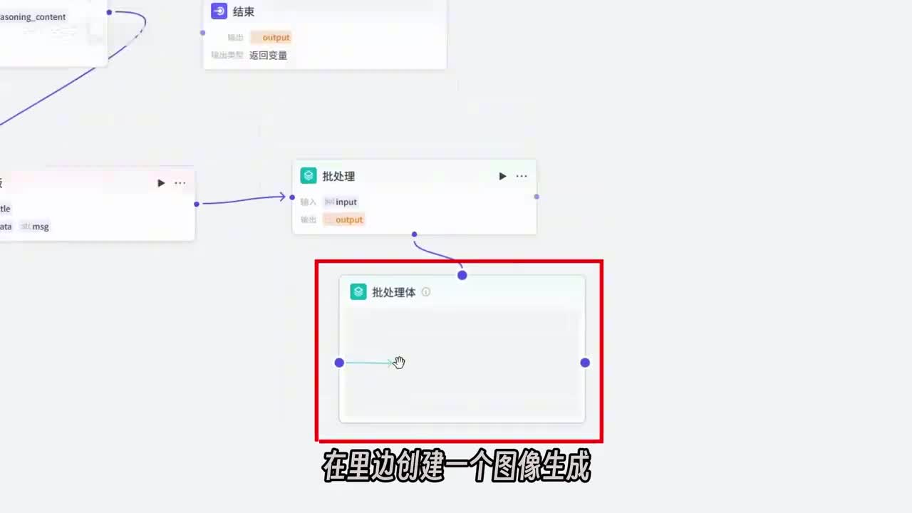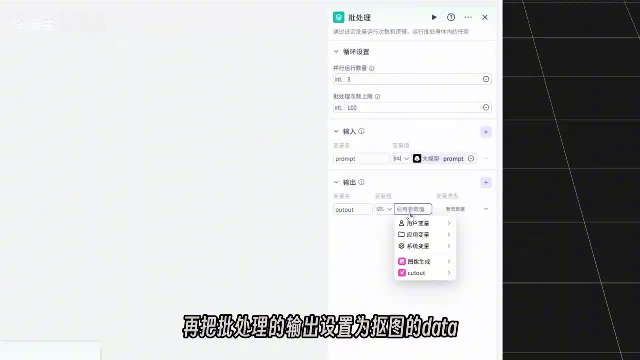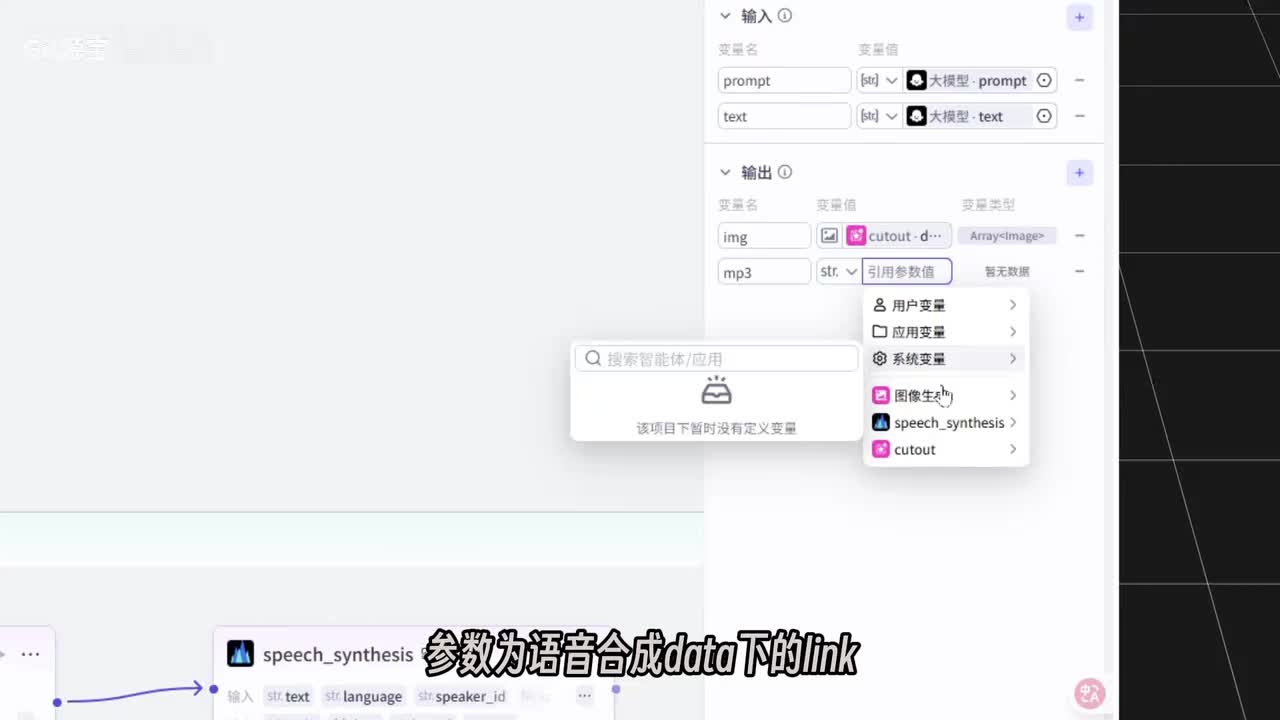 接下来在图片生成的后面。添加抠图上传图,使用图像生成的data。然后将抠图的节点连接到最后,再把批处理的输出设置为抠图的代码,输入变量,增加大模型生成的文本。然后在抠图后增加一个语音合成设置,输入文本为批处理的text。
