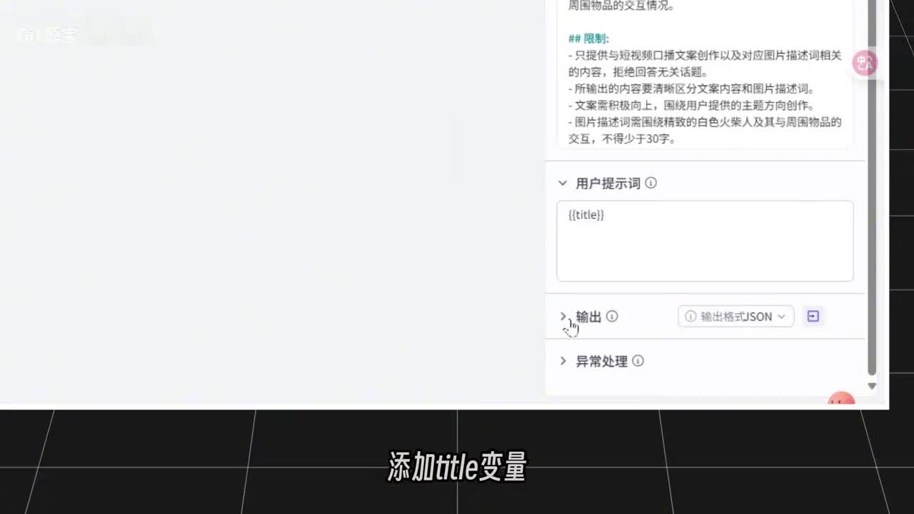 复制这段文字进去,再点击箭头发送,它会自动优化一遍提示词,替换上即可。在用户提示词中输入花括号,添加pyle变量,然后修改输出变量的类型为数组字符串。这两个输出变量都需要修改。开始运行时它就会帮我们写好文本和对应的图片描述词。