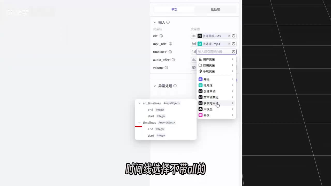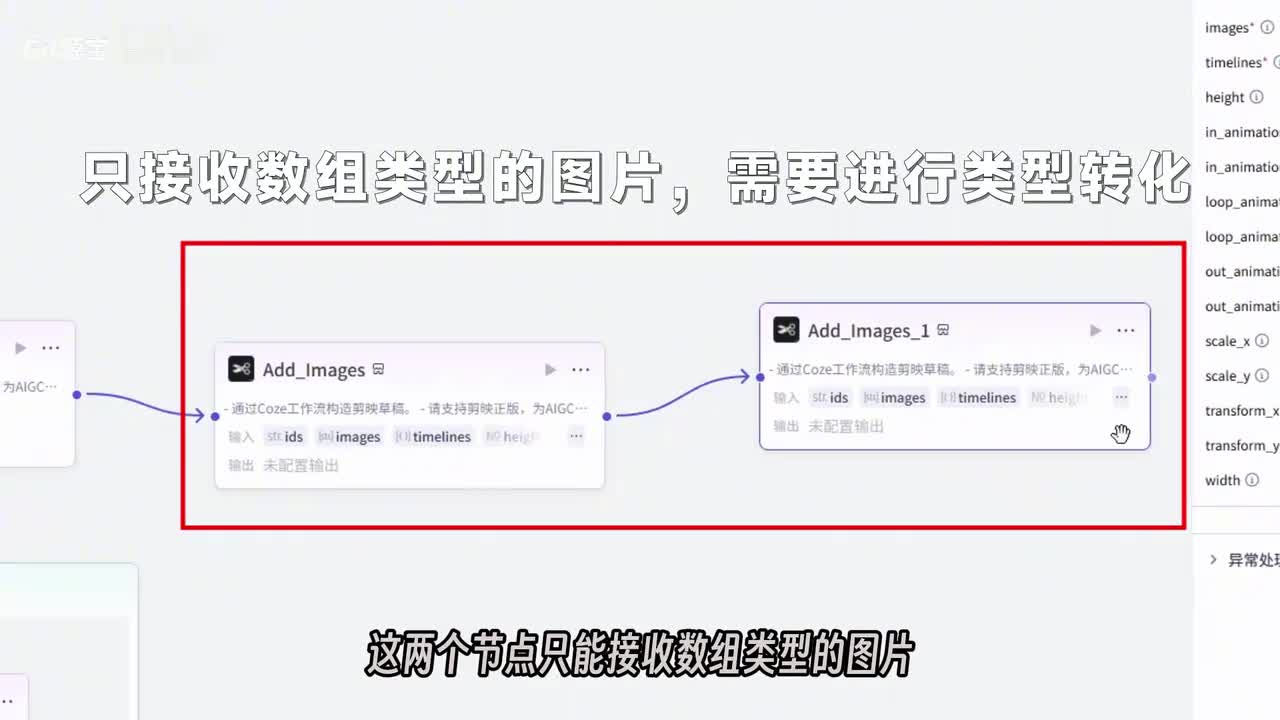 i d s不变。图片选择批处理的i m p,时间线选择不带out的timely。添加图片这两个节点只能接收数组类型的图片,所以需要进行类型转换。我们在音频时间线和添加图片之间添加小助手的文本转数组,输入选择背景中的数据。