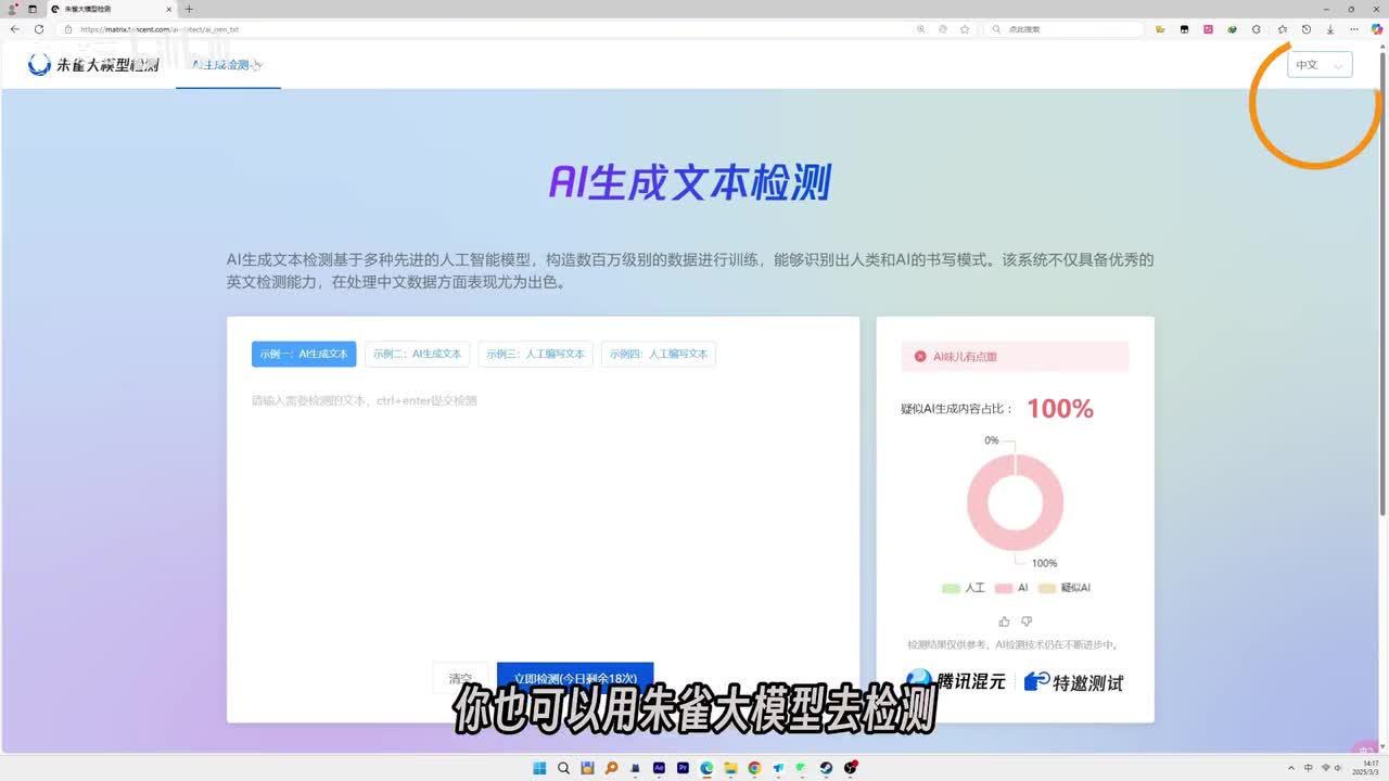 在hung face上也有demo和a p i可以使用,比较适合需要批量检测的同学。除了这个开源项目以外,你也可以用朱雀大模型去检测。右上角可以选择检测语言,左上角可以选择检测文章或者图片,然后在中间上传。就可以看到疑似ai生成的内容占比。