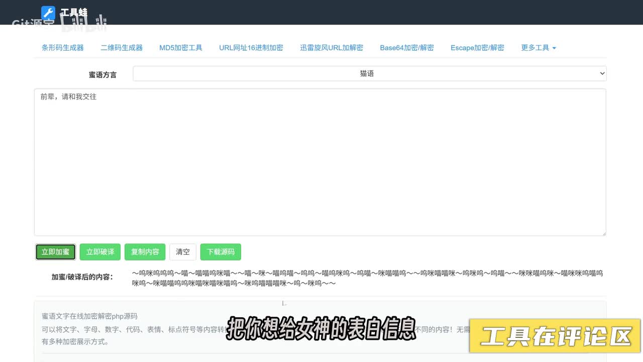 这样你下次看到这种乱码的时候,可以复制到破译工具里,它就能帮你解密。当然你也可以用它来进行加密,把你想给女神的表白信息藏在喵喵叫里。在这里为了巩固一下各位对加密算法的应用,这是一串加密的猫语,你可以尝试破译一下,会有惊喜。
