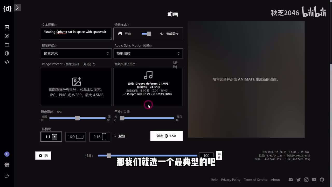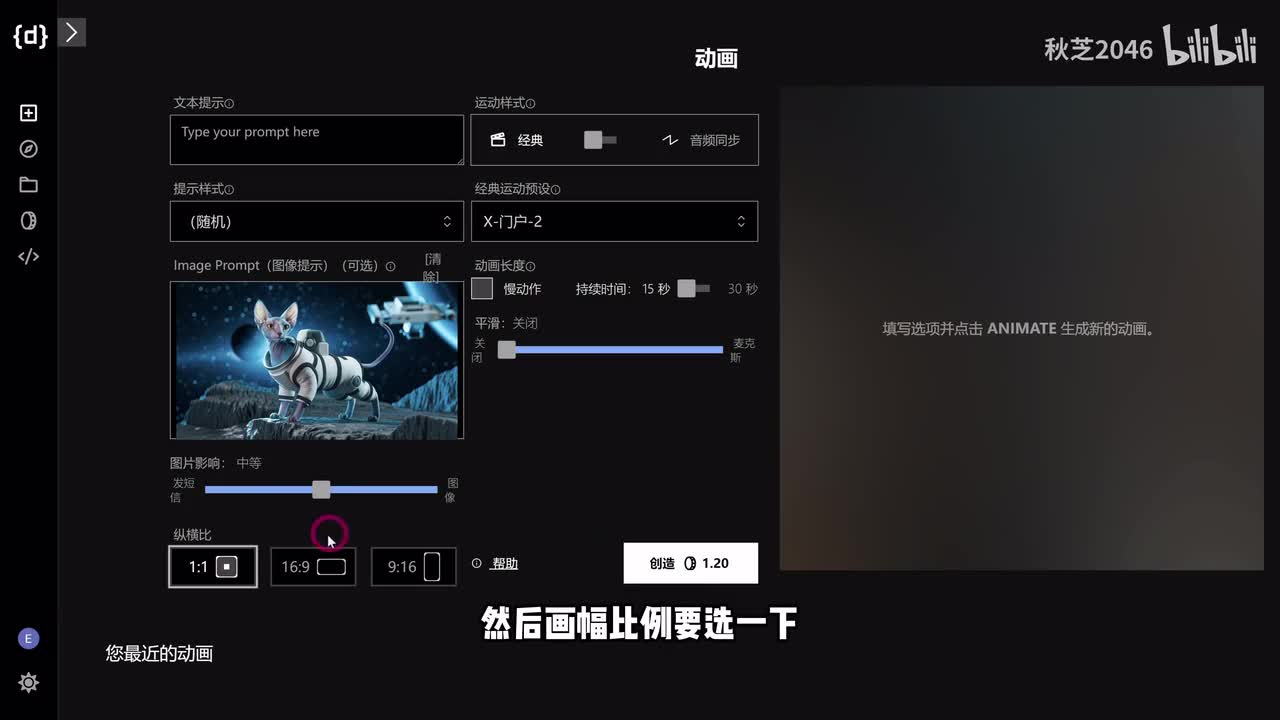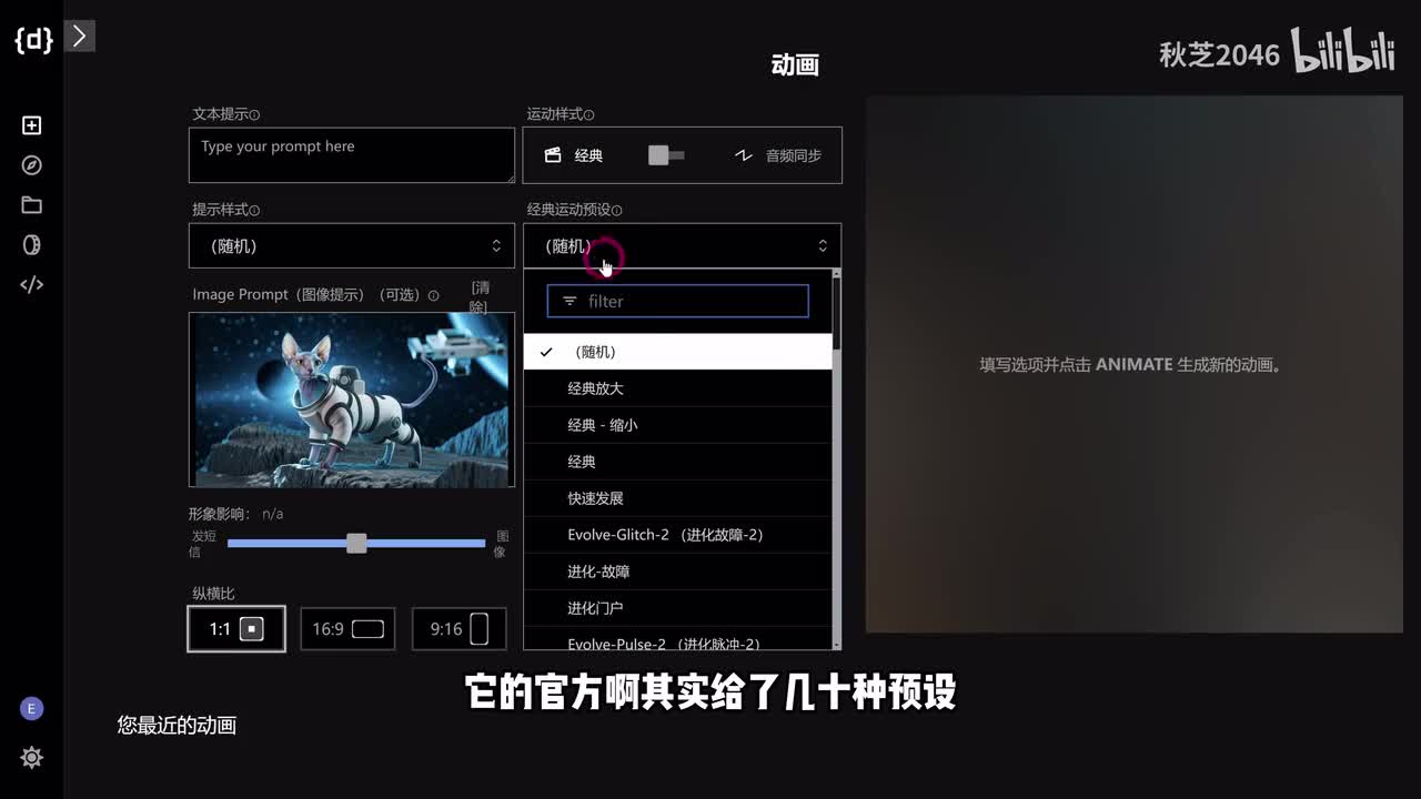 还有飞跃等等等等。那其他的预设大家也可以在它的说明文档里去看到对应的一个预览效果。我们呢就选一个传送门的效果,下面这些都可以先不动,然后画幅比例要选一下,然后点击创建就o k了。当然你也可以只用文字来提示,还可以在这里选择一个画风。