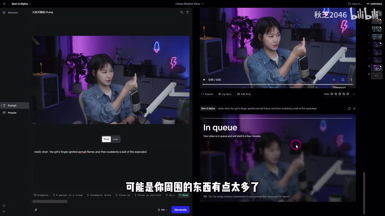 提示词呢先写上固定镜头,然后是我们要的效果。女孩指尖冒出火苗,然后火焰开始爆裂,然后点击生成。那有时候失败了呢,可能是你周围的东西有点太多了,干净一点的背景会比较好识别,或者是就多抽几次。那最后呢再把这个视频跟我们的原视频接上就ok了。