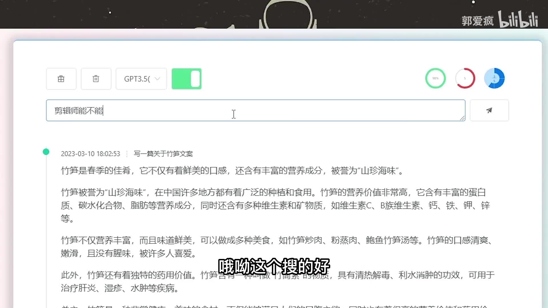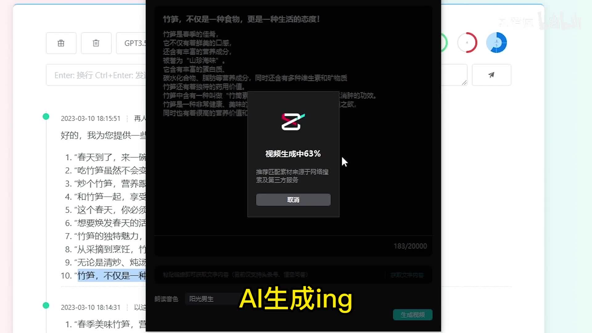最近挺火那个a i网站,叫啥这么土啊,chat g p t啊。对,chat g p t做片子最重要的是什么?是不是文案?嗯,最近呢咱们不是要做个竹笋广告吗?今天我们用那个a i网站生成文案之后,再用剪映ai生成视频,看一下最终的效果是什么样。之后呢我们自己亲自去拍这个竹笋,我们自己真人去做一下,跟这个a i视频去对比一下,我们看一下他们的优缺点。其实a i生成我用过啊,那个一键生成的片真的烂的一批错了。