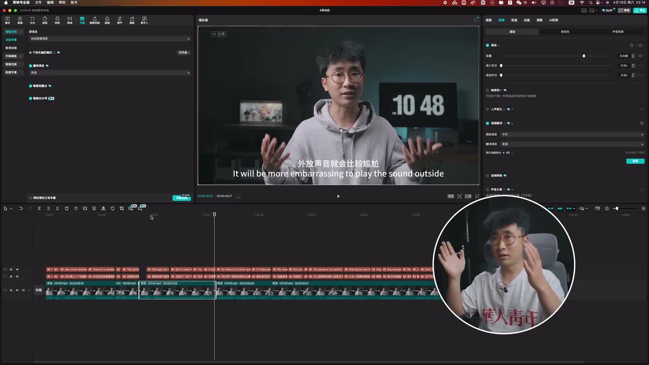 如果说视频的双语字幕还不能满足你的需求,你想把你的视频直接推广到国外,就是更直观一点。那这个视频翻译的功能我就非常值得一试。就是你把你的全部片段,中文片段直接框选下来,找到音频下面的视频翻译,把它给勾选上。