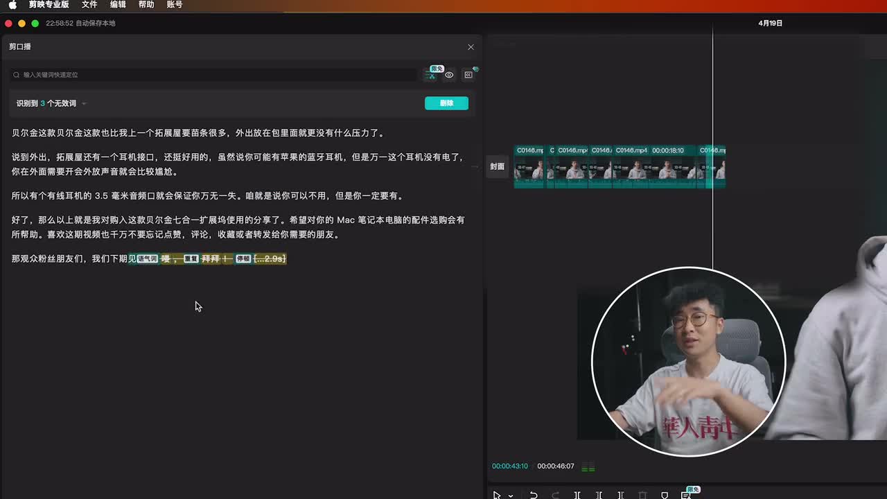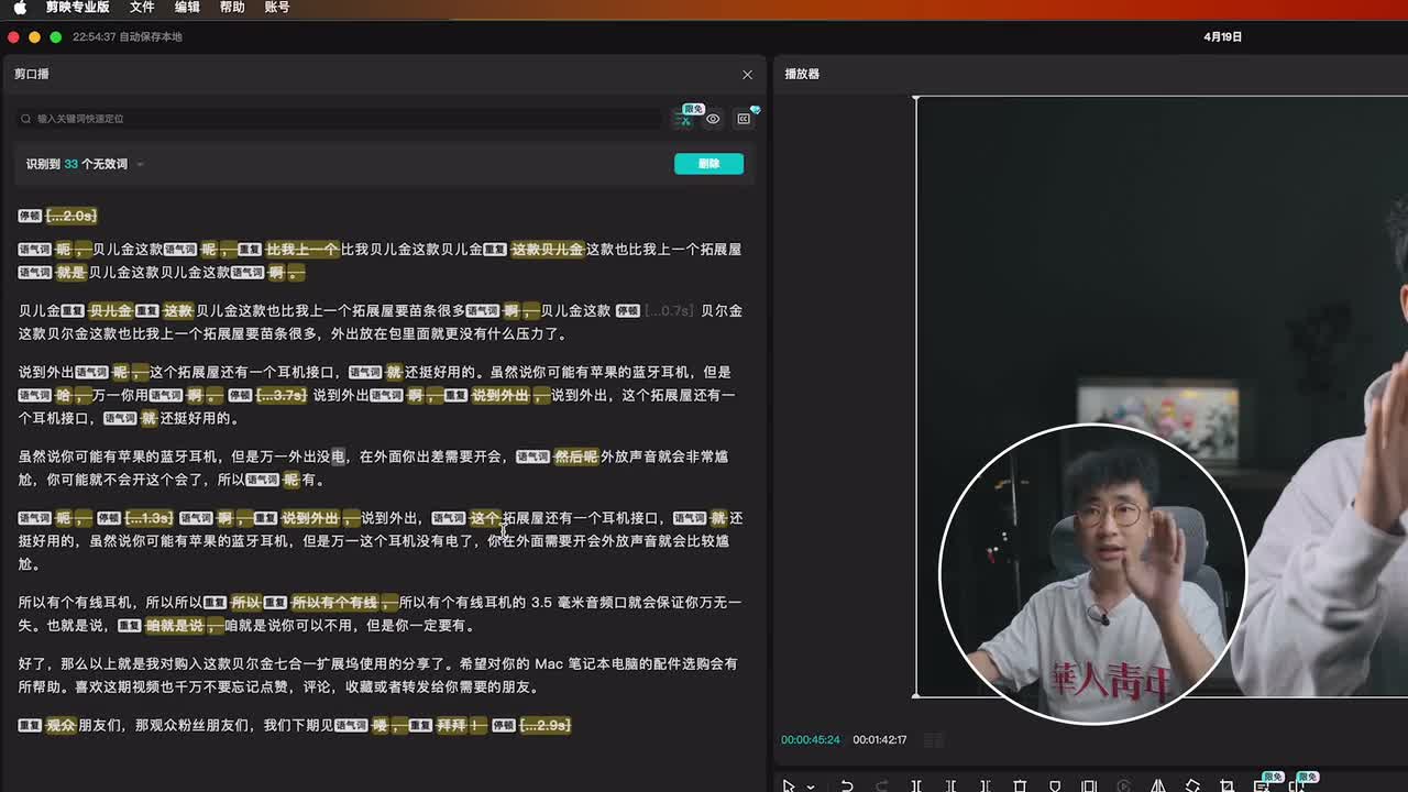 你点一下之后,它就会把你录制的视频说的话直接变成一个文案。然后呢你看到这个文案进行剪辑就可以了。比如说我看文案发现我这之前说的全是废话,我直接框选一下。