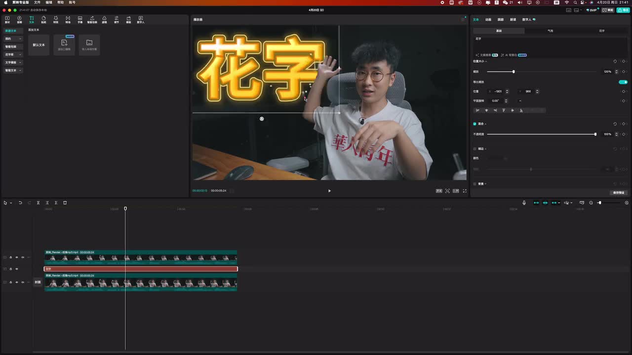 要做到这点也很简单,选择你要生成的片段,找到画面下方的抠像,勾选智能抠像,这样人物就被单独勾选出来了,然后复制一层,把下面这层的视频的智能抠像取消勾选,然后中间插上花字,就可以制作出这个文字出现在人后面的效果了,比起普通的着重强调字幕,效果会好上很多。这些ai功能说实话让视频制作的门槛变得非常低,你只需要点来点去,就可以完成一些复杂软件才能完成的操作。作为一个剪辑新手,剪映可以说是一个非常友好的软件,有些功能甚至连专业软件都没有。