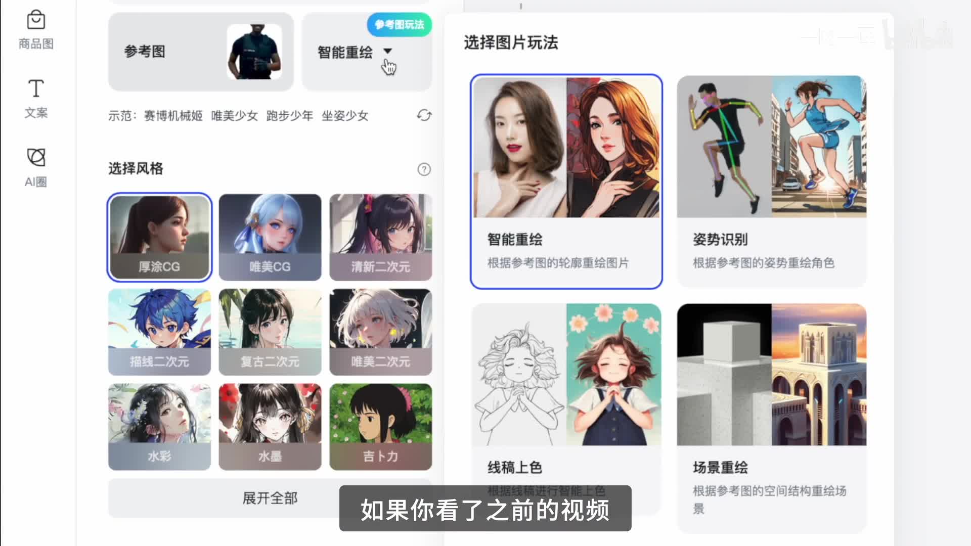 简单来说就是根据图片来生成图片。就比如这张图,我相信没有人不知道吧。我以后选择智能重绘。如果你看了之前的视频,那这个界面你应该会非常熟悉。我这边选第一个,再选一个风格就可以点生成按钮了。
