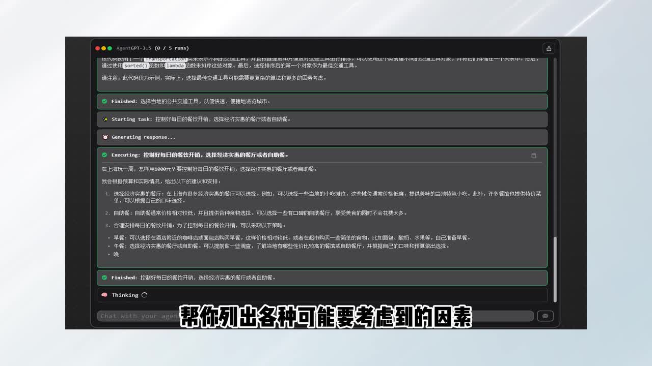 如果做一件事情你不知道如何下手,只需要给它设定一个目标,它就会。帮你一步一步分解任务并且给出解决方案。比如你可以问他怎样用一千元在上海玩一周,a i就会帮你自动思考制定完成目标需要的任务,帮你列出各种可能要考虑到的因素,并给出建议和实质性的步骤。还有比如你可以问他如何开一个咖啡馆,如何做一份某品牌的市场调研报告,如何用代码写一个小游戏等等,在遇到这种问题的时候,你不妨试试这个工具,一定会帮你瞬间打开思路。