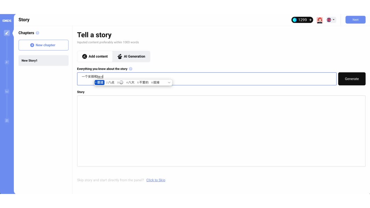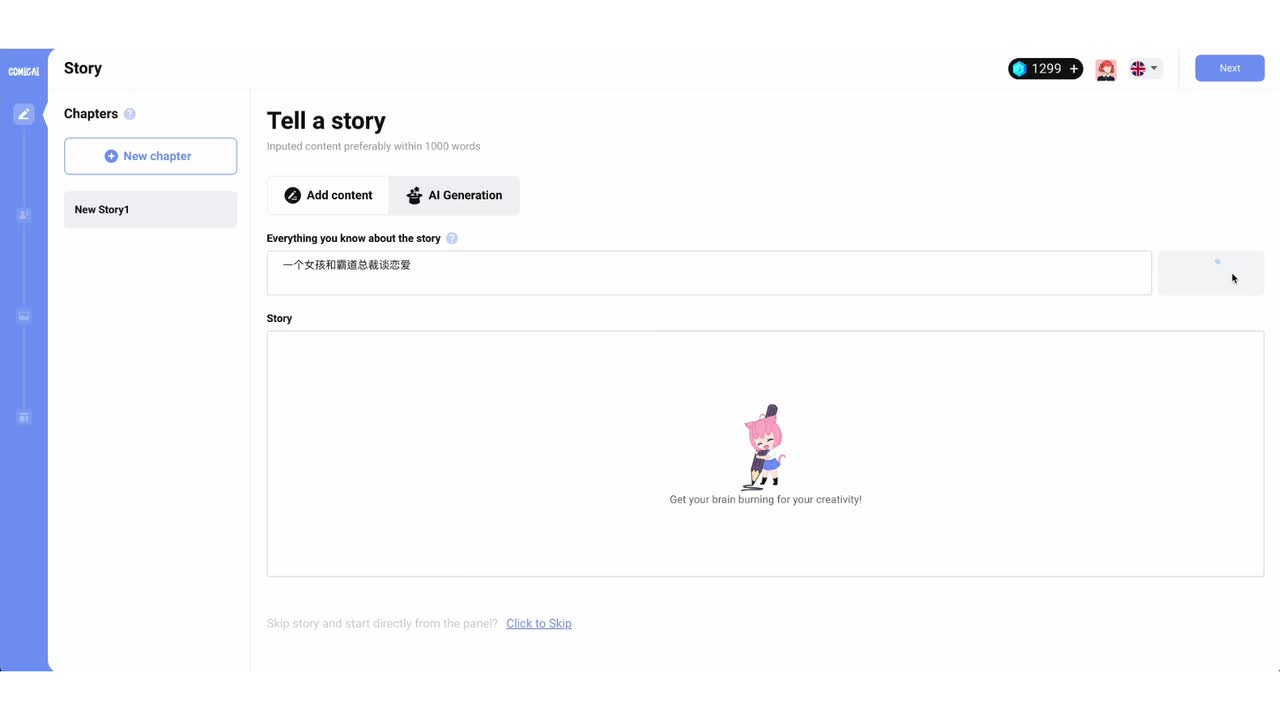 如果你比较有想法,自己很会讲故事,可以直接在上面写,或者上传对应的t x t或p d f文档。第二种a i创作,在comick的网站里直接内嵌了ai创作的入口。你只需要大概写下你的想法,它就会自动生成一个比较完整的故事。我试了下,无论输入中文还是英文都可以生成对应语言的,所以不用担心。