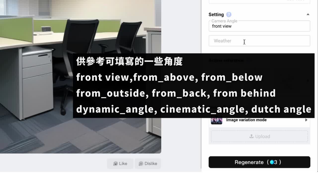 比如你想要一个没有人物的纯空镜画面的话,也可以在这里把人物都取消勾选。然后下面是一些配置项,包括相机的角度,比如front view,front above, front below, 或者天气rainy day、sunny day, 以及你希望人物做的动作。如果都没有你喜欢的,你也可以选择上传自己的参考图。不过这个需要有会员权限,这就是类似于图生图的效果。