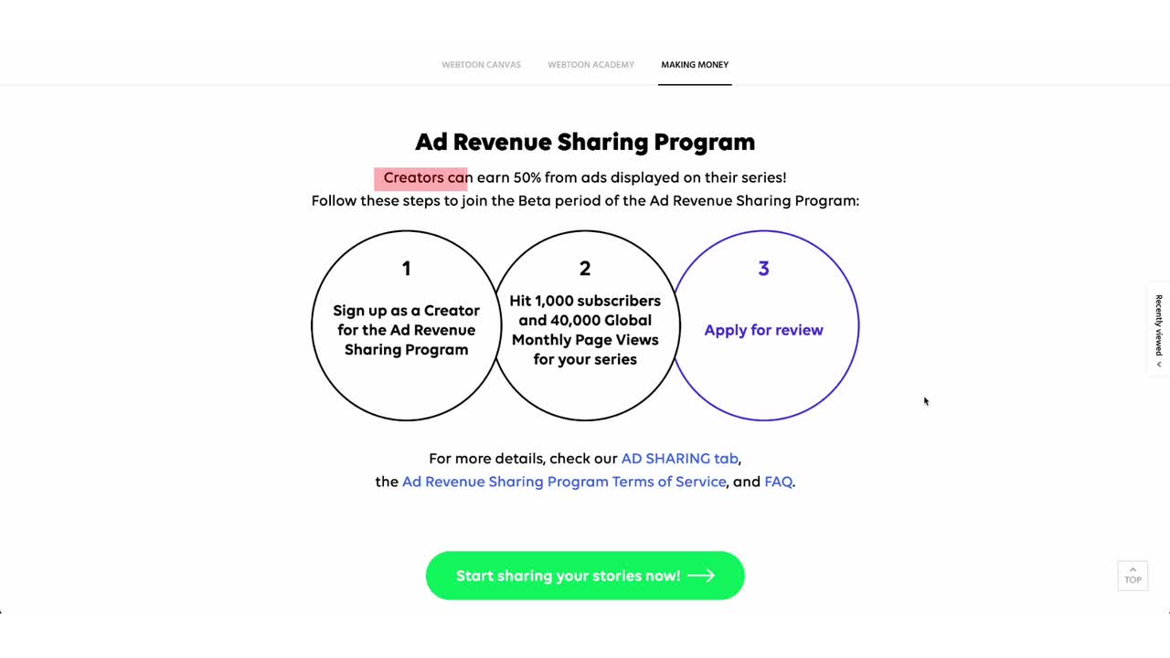 最后我和大家聊一聊这类漫画的变现方式。方式一,投稿到各类漫画平台或网站,比如像web tone就是一个托管各种漫画的网站,入驻的创作者可以从自己的作品中获利,获得百分之五十的广告收益和利用一些众筹平台让粉丝成为铁粉并赞助你,从而获得资金。如果和youtube一样开通广告收益需要打。成一千粉丝和全球每月页面浏览量达到四万次。