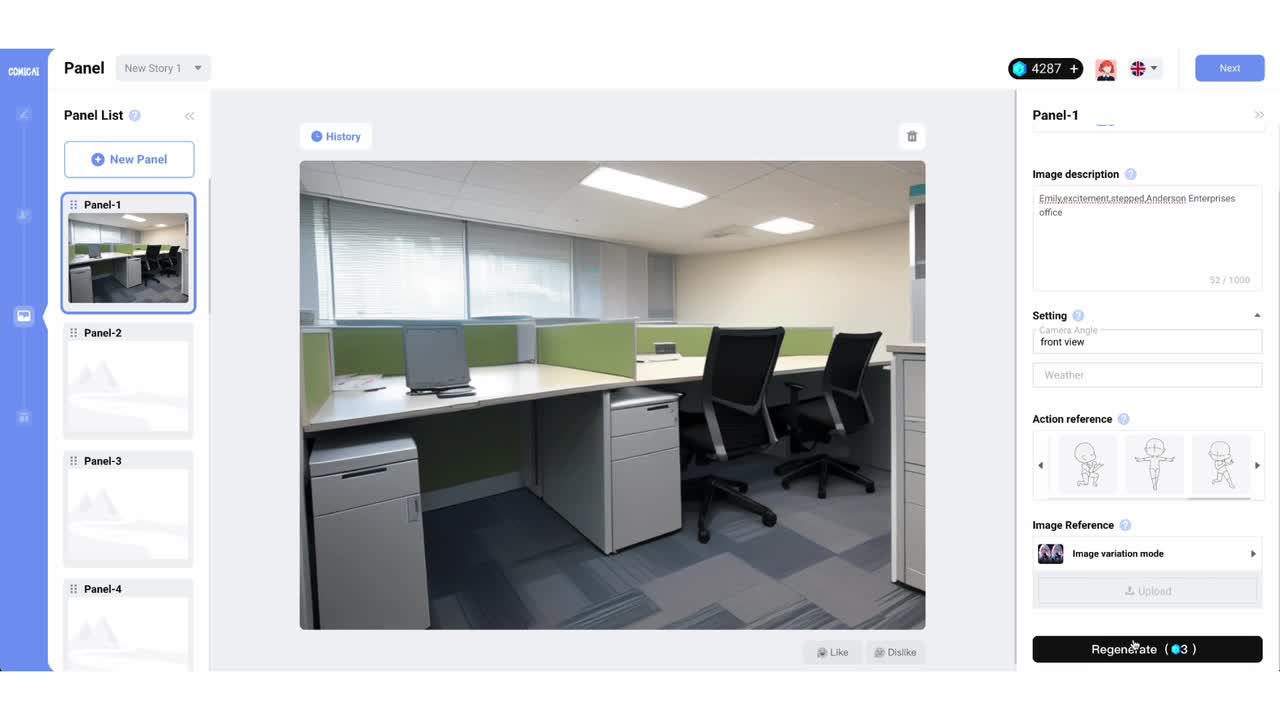也可以直接在history这里找到之前所有的生成记录,我们把画面逐个生成一下,可以看到这里人物所有的发型形象,包括衣服基本都是保持统一了的,是不是超级牛。第五步,把画面拼在一起。大家看过漫画应该都有印象,经常是这样四宫格或者更复杂的排版。那么我们刚才生成的所有分镜以后,也可以直接在平台里面把它们拼成一部完整的漫画。