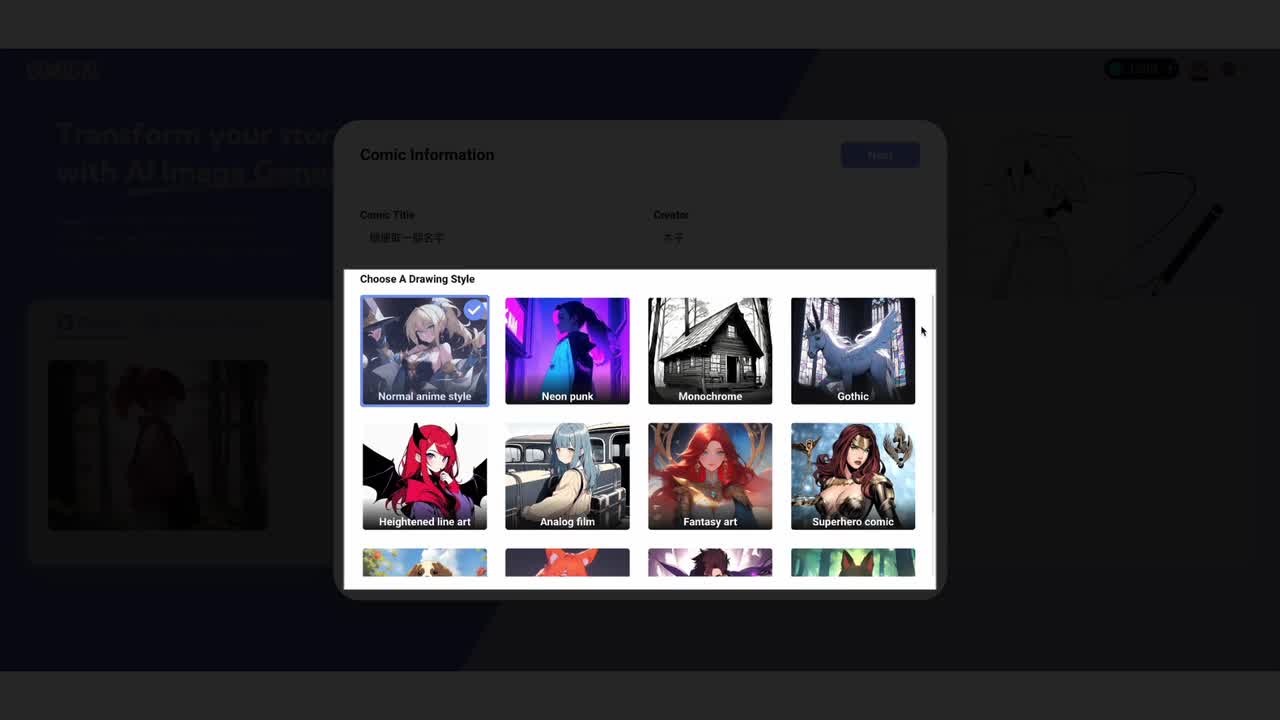 第一步,选择漫画风格,点击开始创作。我们需要填写这部漫画的名字和你的名字,然后下面选择画风。这里一共有十二种画风可以选择,基本上已经涵盖了比较主流的风格。那我这里就选择最普通的。